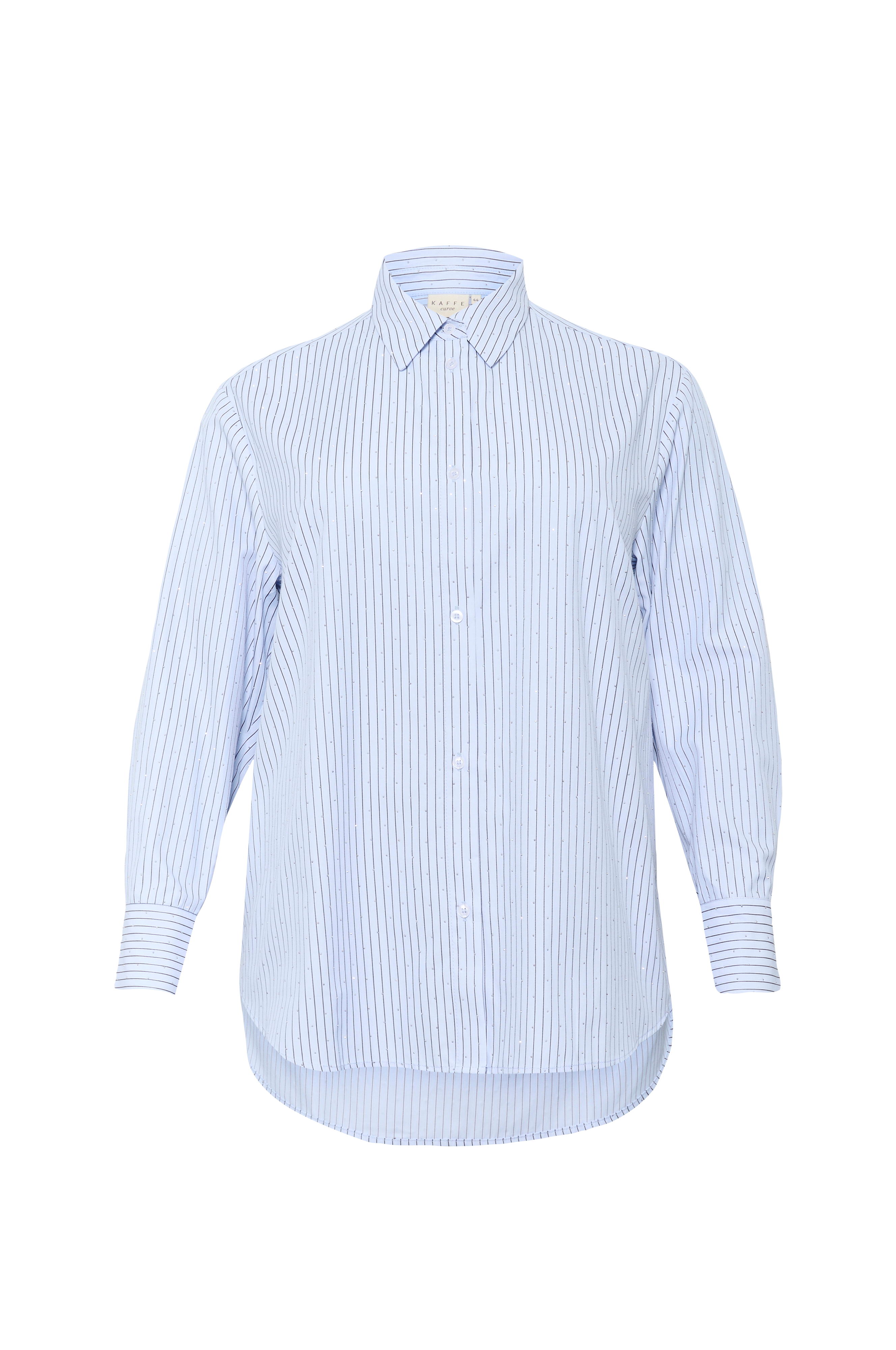• Stribet skjorte med glitrende rhinstene hele vejen rundt• Knapper foran• Manchetter ved manchetterne• Længere bagside med afrundet nedre del• Plusstørrelser