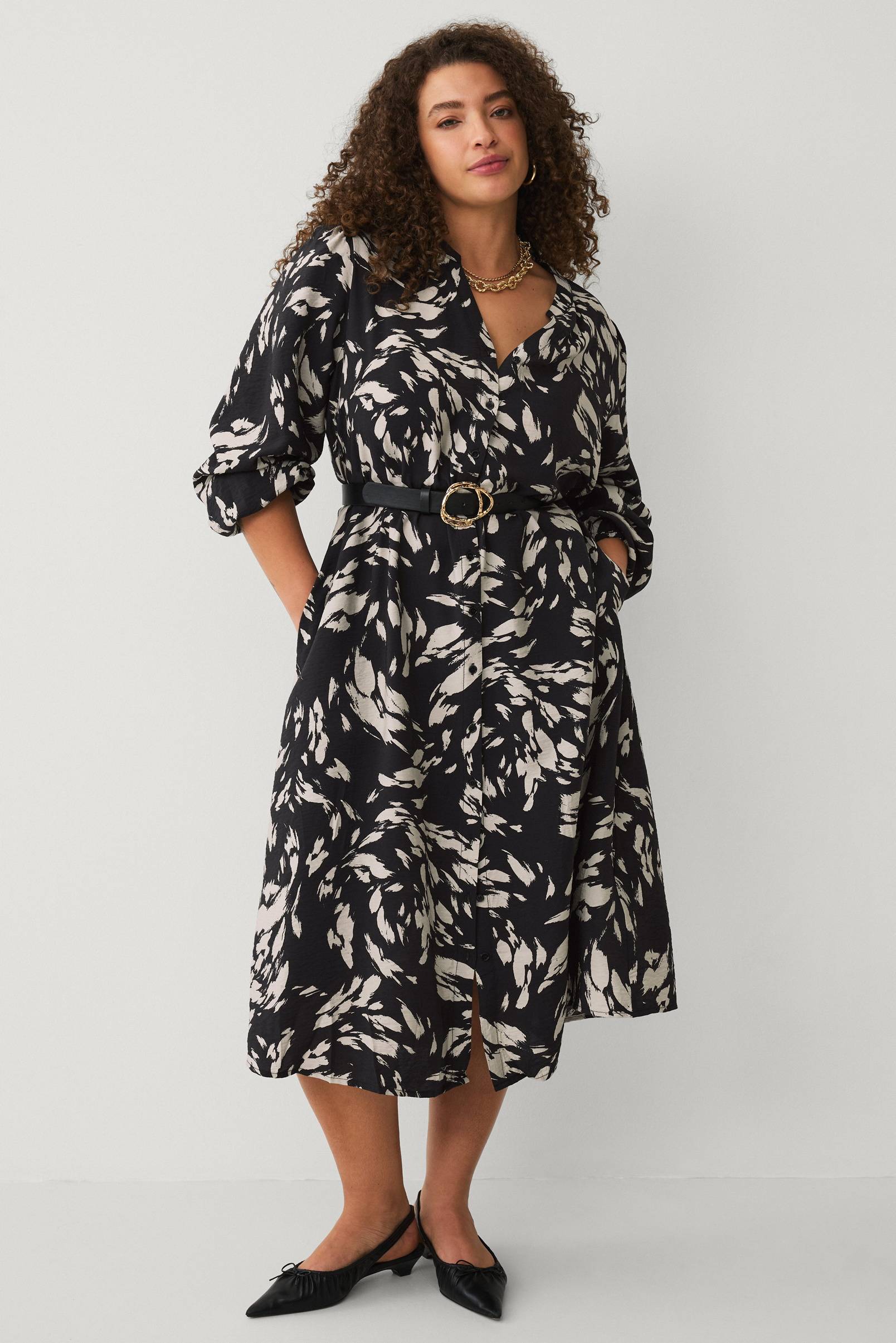 • Skjortekjole i let krøllet materiale• V-formet halsudskæring• Lange pufærmer med elastiske ærmeafslutninger• Knapper foran• Aftageligt bindebælte ved taljen• Sidelommer• Plusstørrelser• Længde: 125 cm i størrelse 44