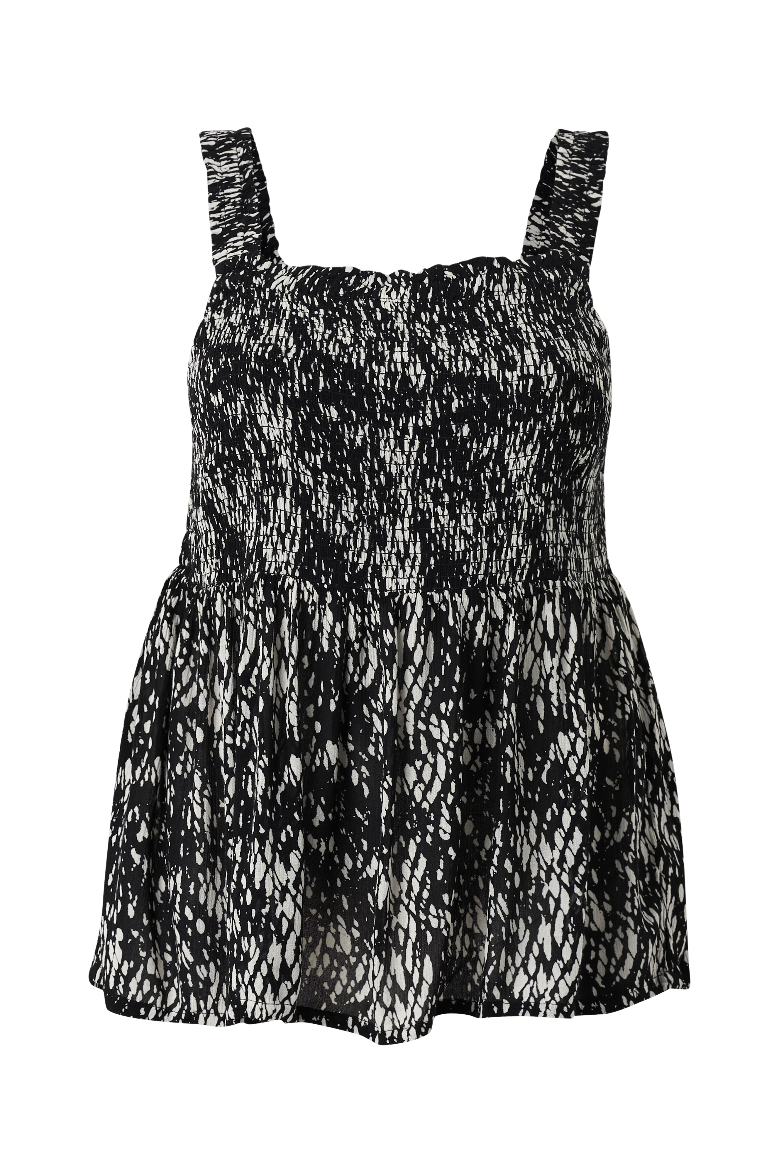 • Top med et zebramu00f8nster• Smock på toppen• Elastiske, rynkede skulderstropper• Store størrelser
