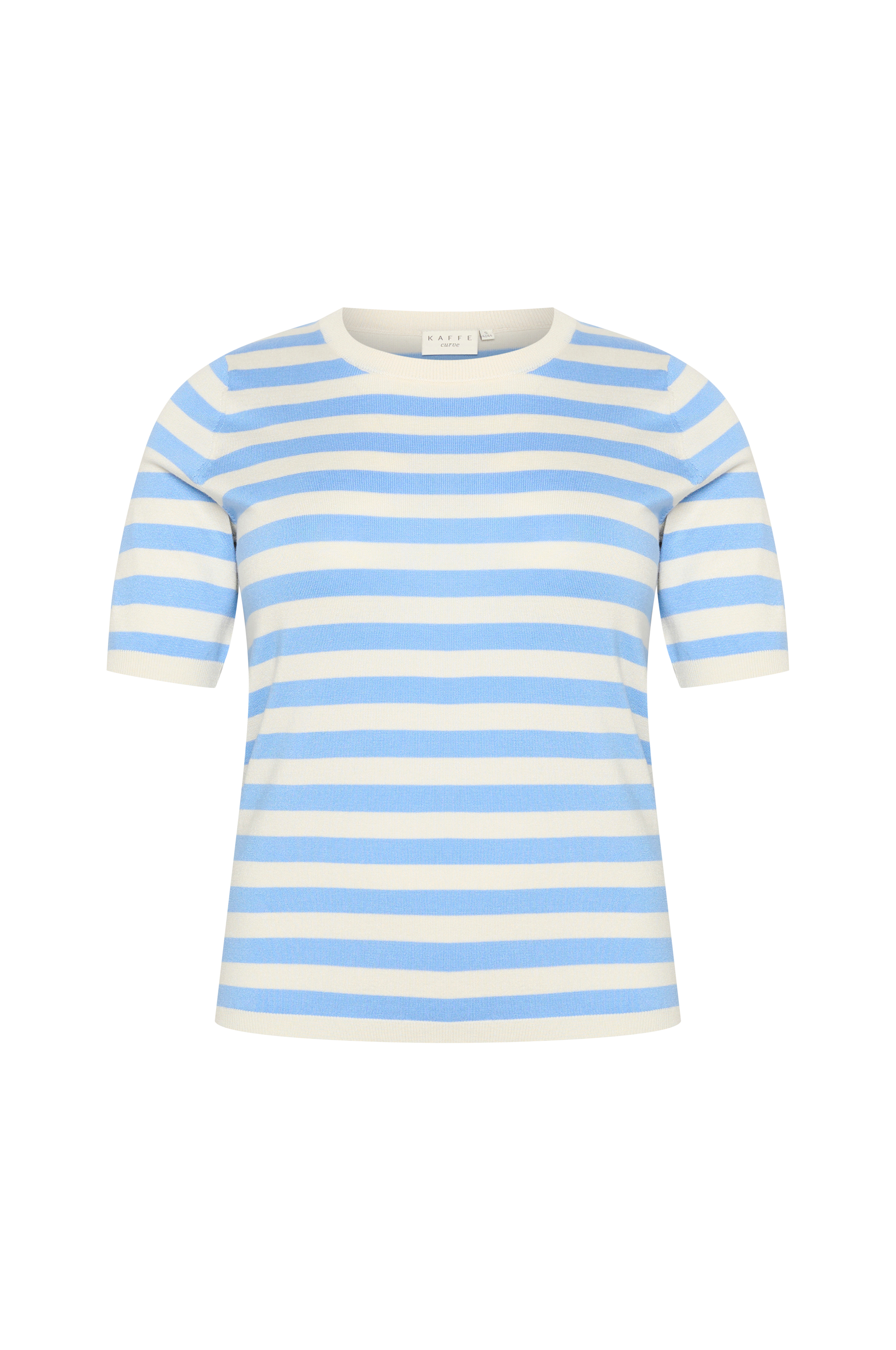 • Store størrelser• Model med fintstrikkede striber• Rund hals med ribstrik• Kort ærme• Ribbet kant ved manchetterne og nederst
