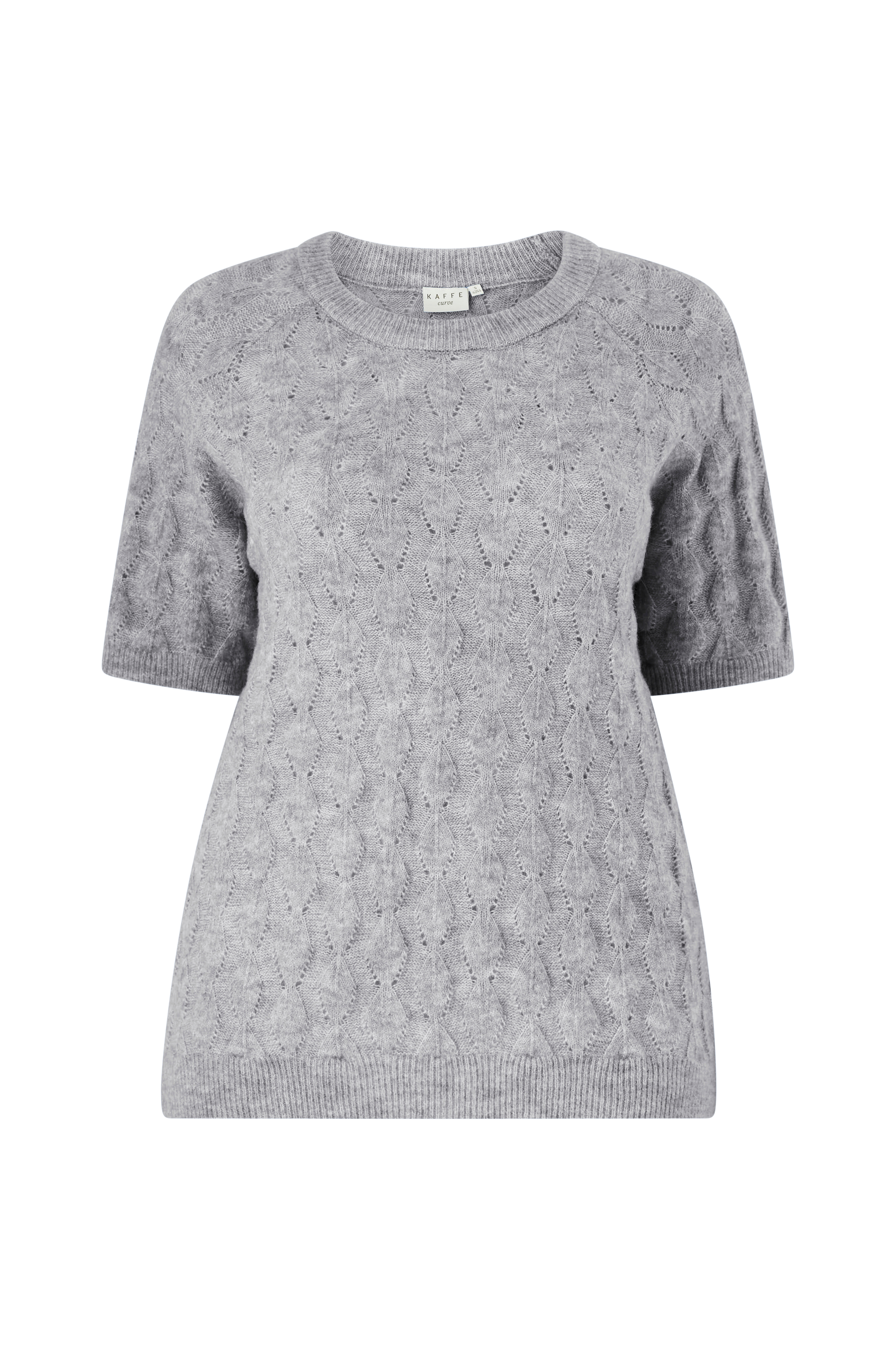 • Store størrelser• Uformel, mønsterstrikket model• Rund hals med ribkant• Kort ærme• Ribstrik ved manchetterne og nederst
