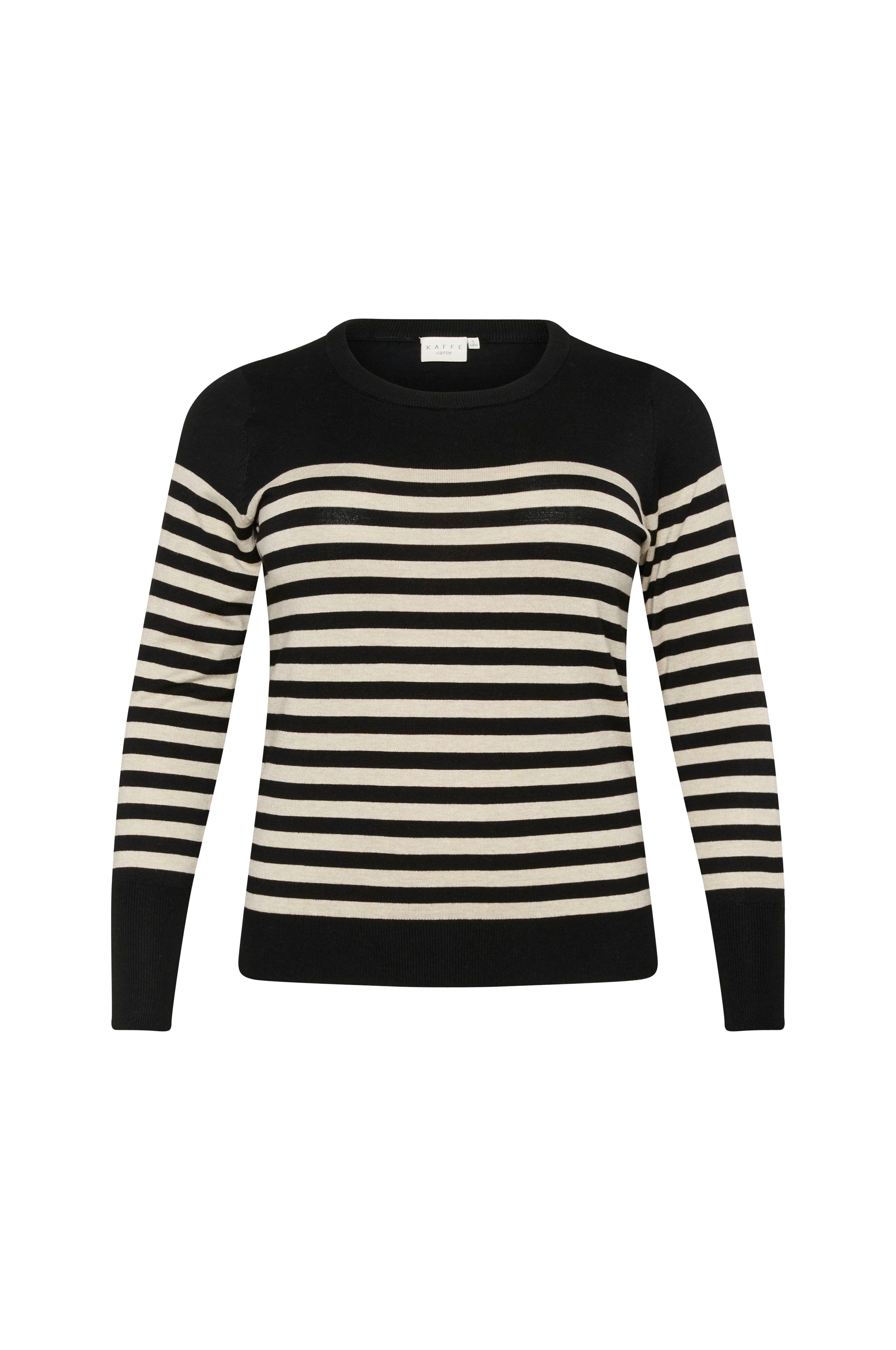 • Store størrelser• Model med strikkede striber• Rund, ribstrikket halsudskæring• Ribstrik ved manchetterne og nederst