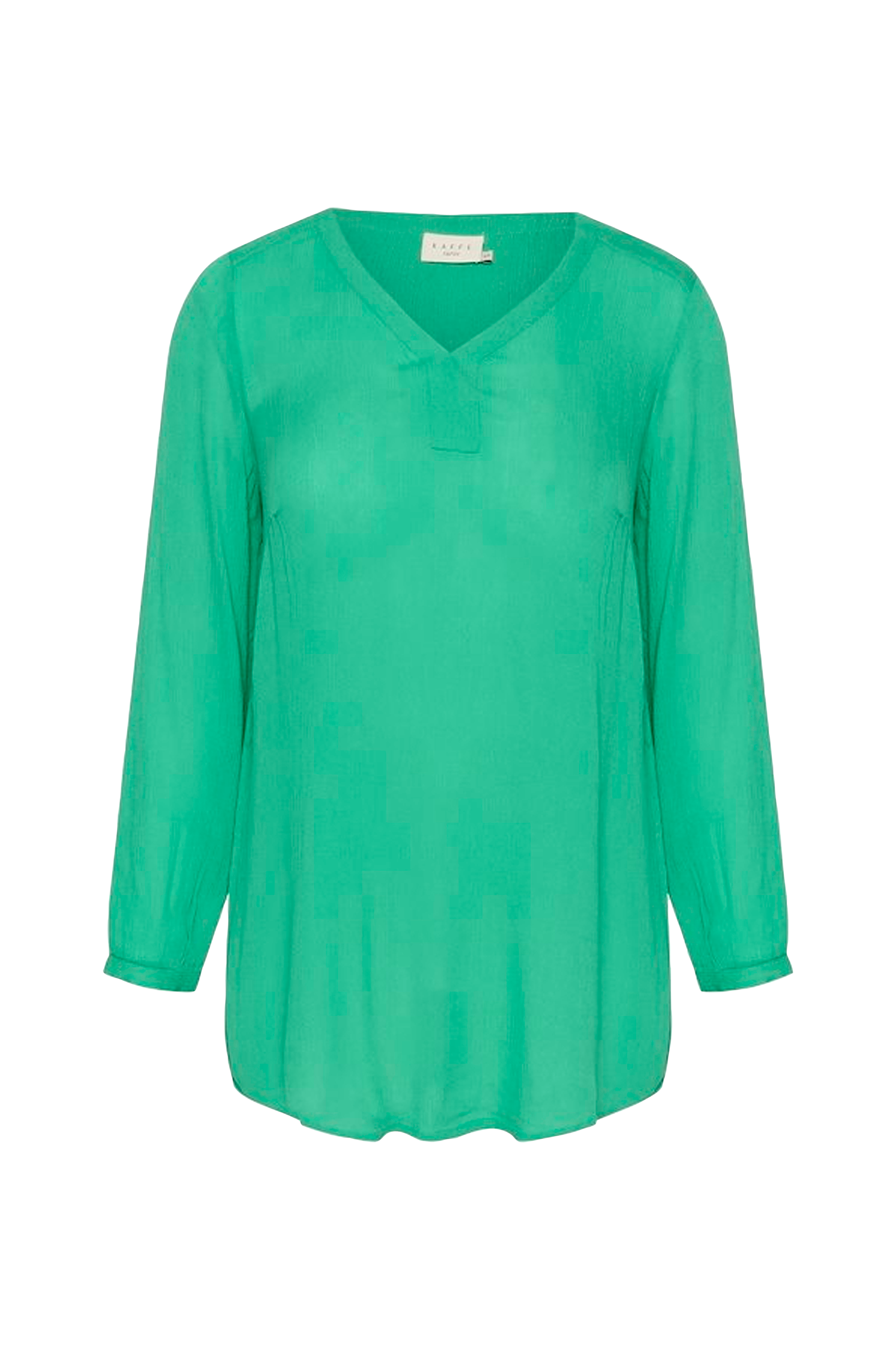 Tunika ccAmi V.Neck Tunic fra Kaffe Curve i tynd, crepet viskose. V-udskæring foran og lange ærmer med smal manchet med knap i ærmekanten. Længde ca. 90 cm i str. 44.