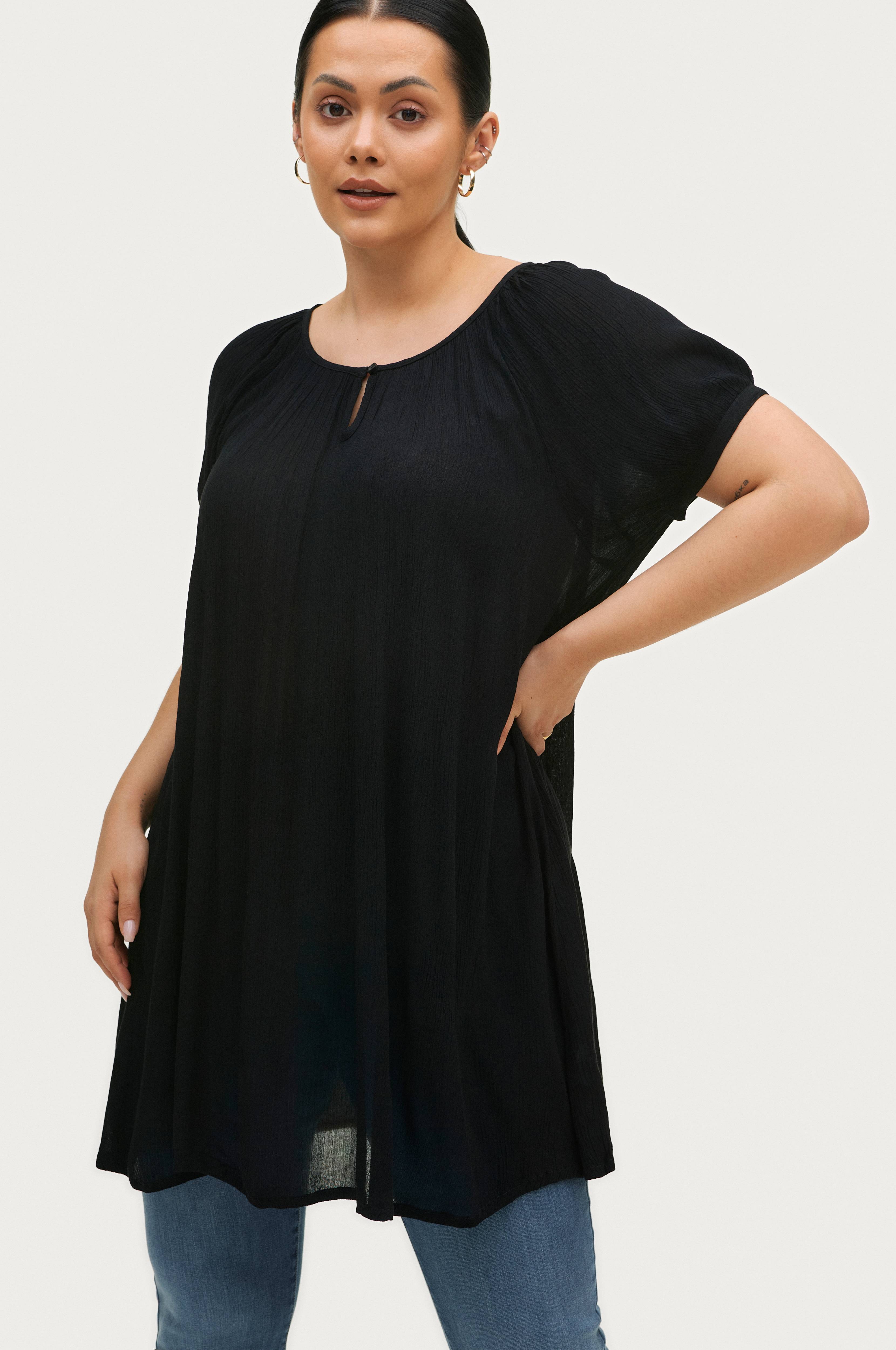 • Tunika i tynd viskose med rynket struktur • Korte korte ærmer med manchet, knap og nedsænkede skuldre • Afrundet halsudskæring med lille åbning med knap • Store størrelser • Længde: 98 cm i størrelse 44