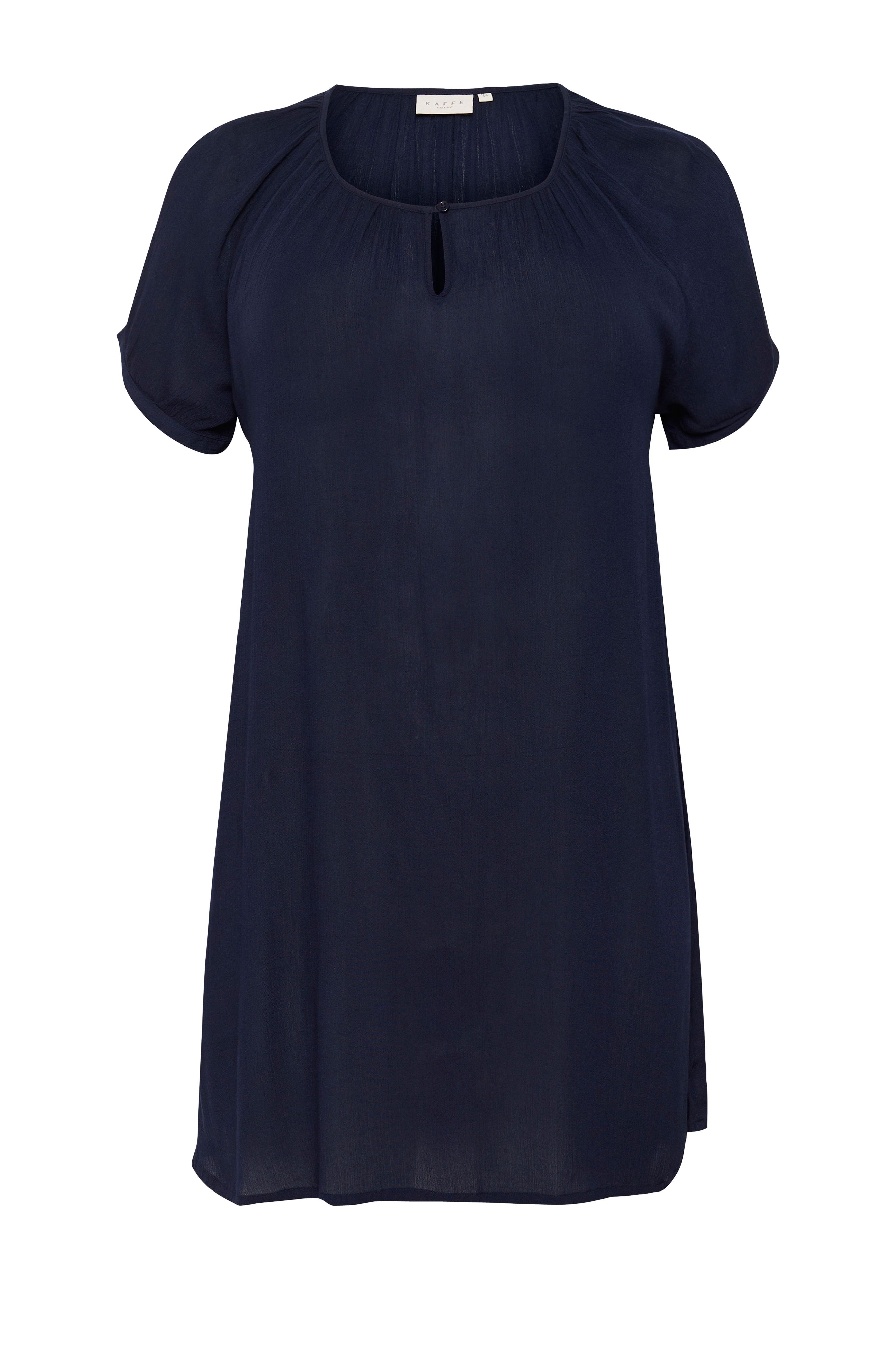 • Tunika i tynd viskose med rynket struktur • Korte korte ærmer med manchet, knap og nedsænkede skuldre • Afrundet halsudskæring med lille åbning med knap • Store størrelser • Længde: 98 cm i størrelse 44