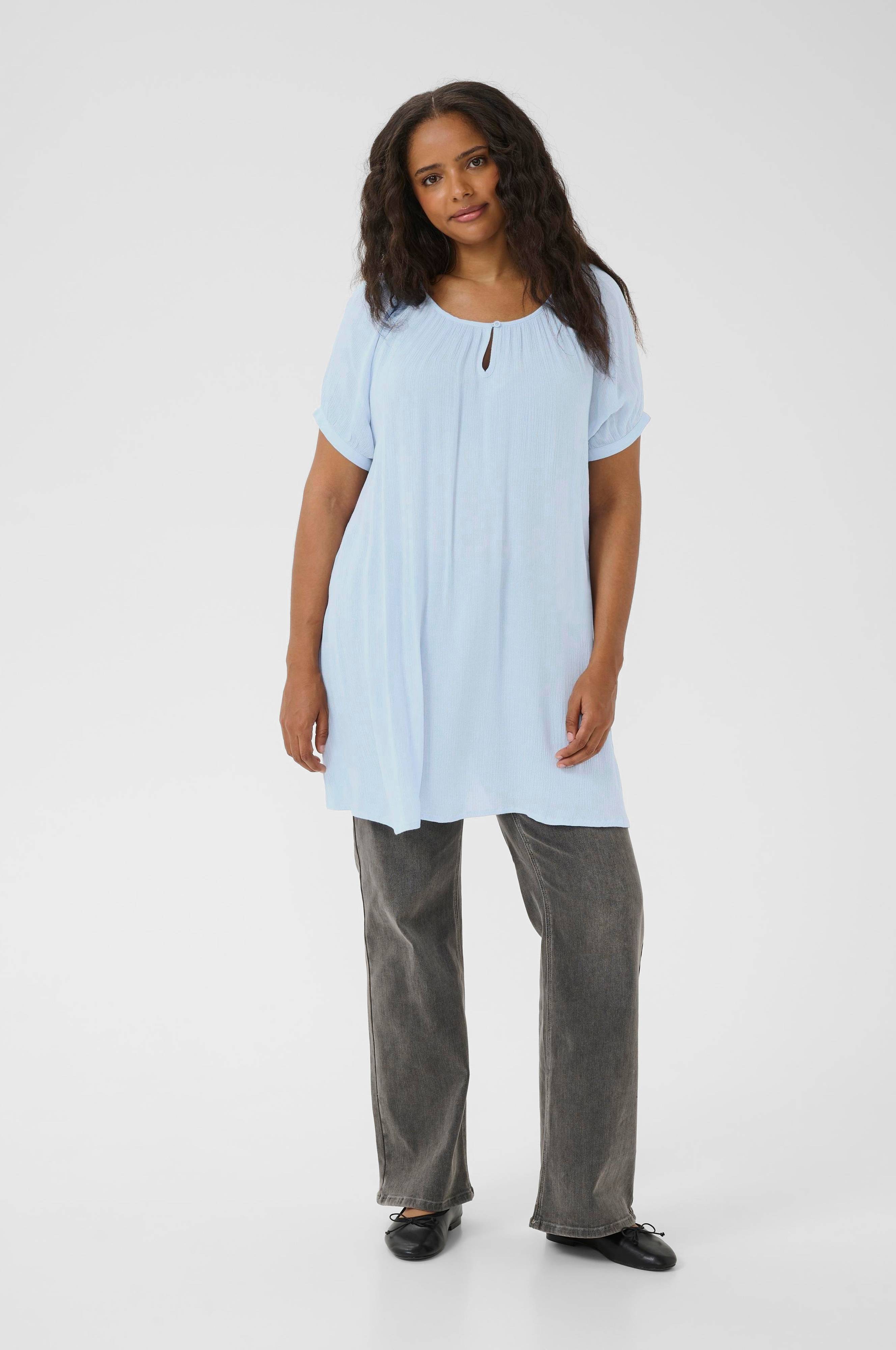• Tunika i tynd viskose med rynket struktur • Korte korte ærmer med manchet, knap og nedsænkede skuldre • Afrundet halsudskæring med lille åbning med knap • Store størrelser • Længde: 98 cm i størrelse 44