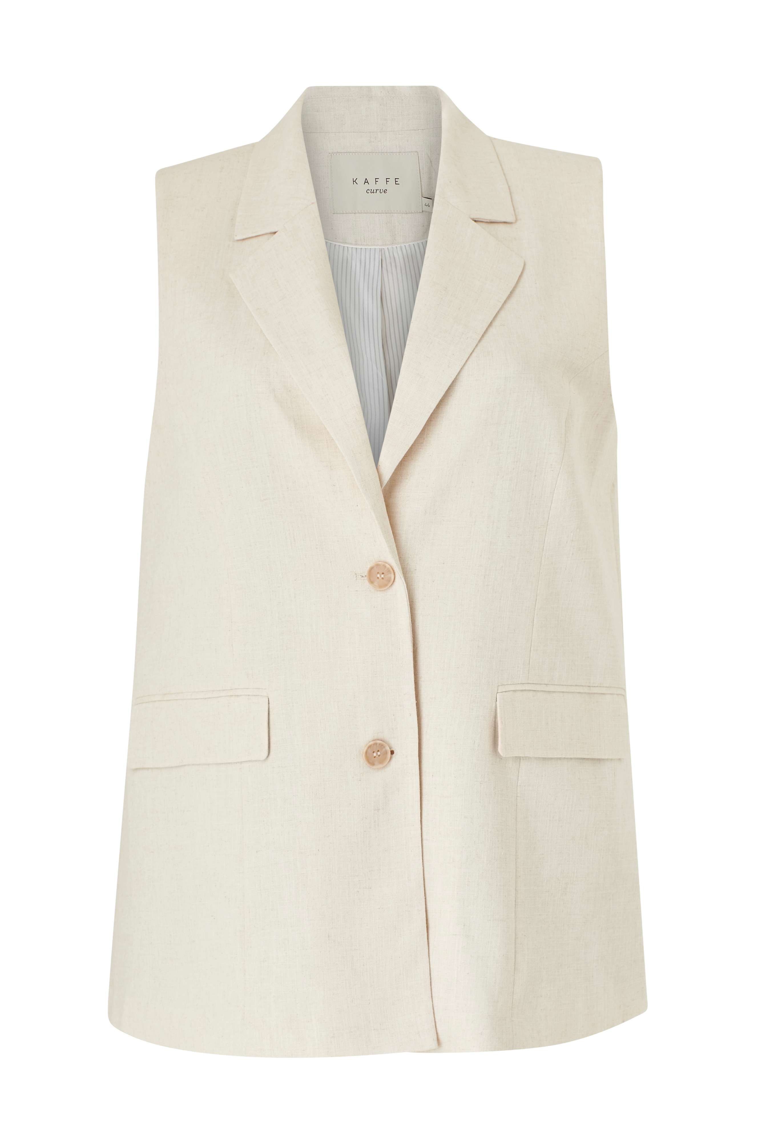 • Store størrelser• Ærmeløs model med krave og revers• To knapper foran• Paspolerede lommer med låg• Skulderpuder• Foret• Længde: 82 cm i størrelse 44