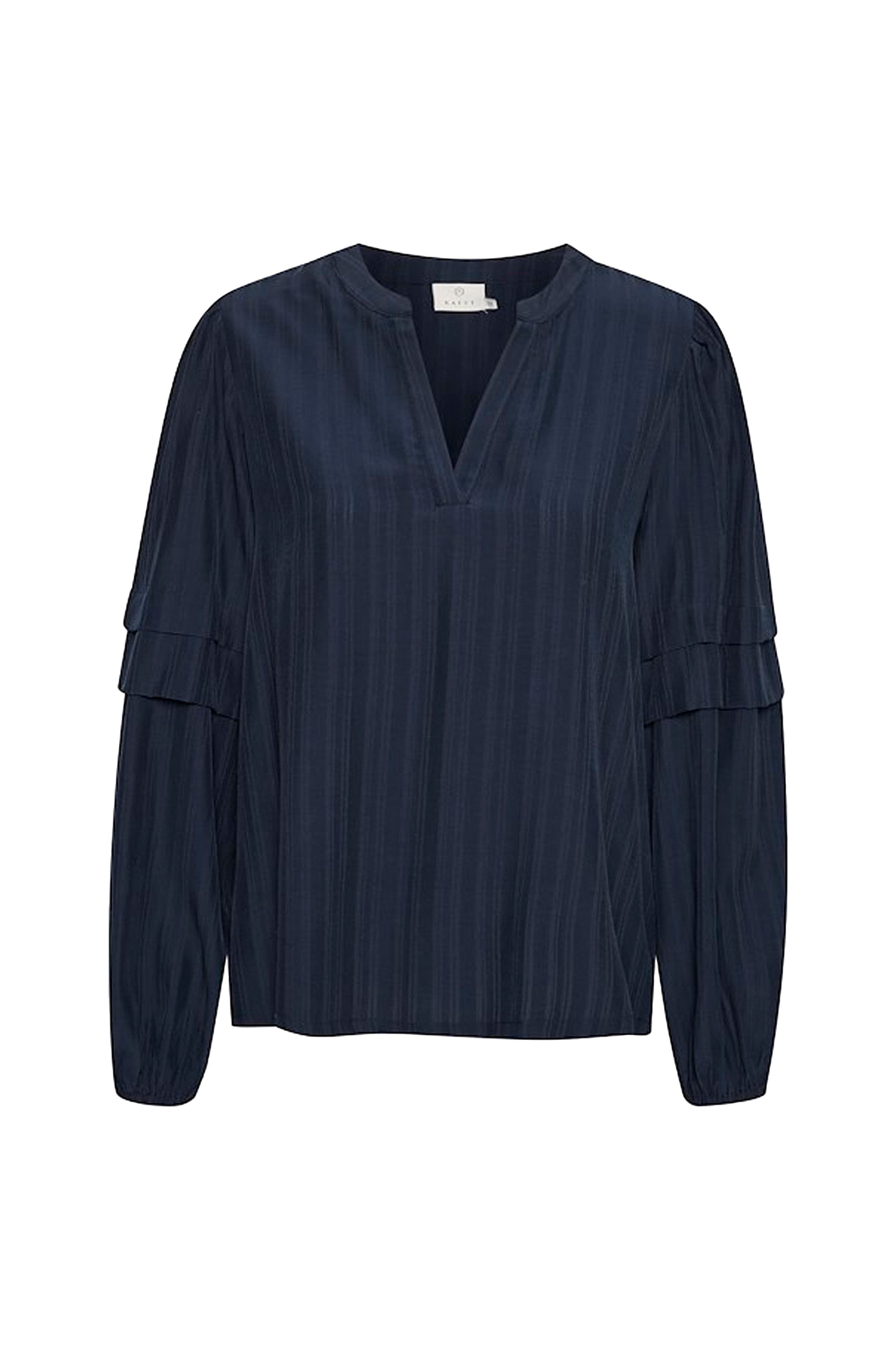 • V-formet halsudskæring• Brede ballonærmer med påsyede volanter• Elastisk bånd ved manchetterne