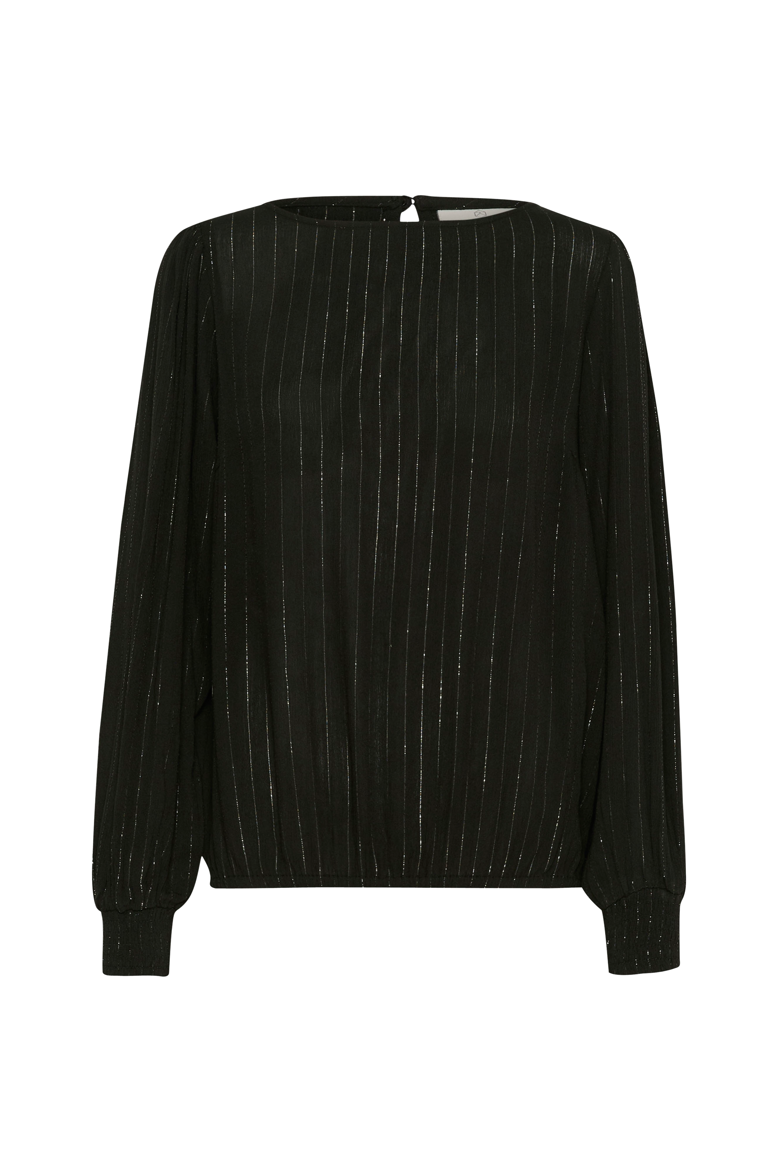 • Bluse i rynket materiale med glimmertråd• Rund halsudskæring med knap i nakken• Lange pufærmer med smock ved manchetterne• Indvendig elastik ved nederste kant