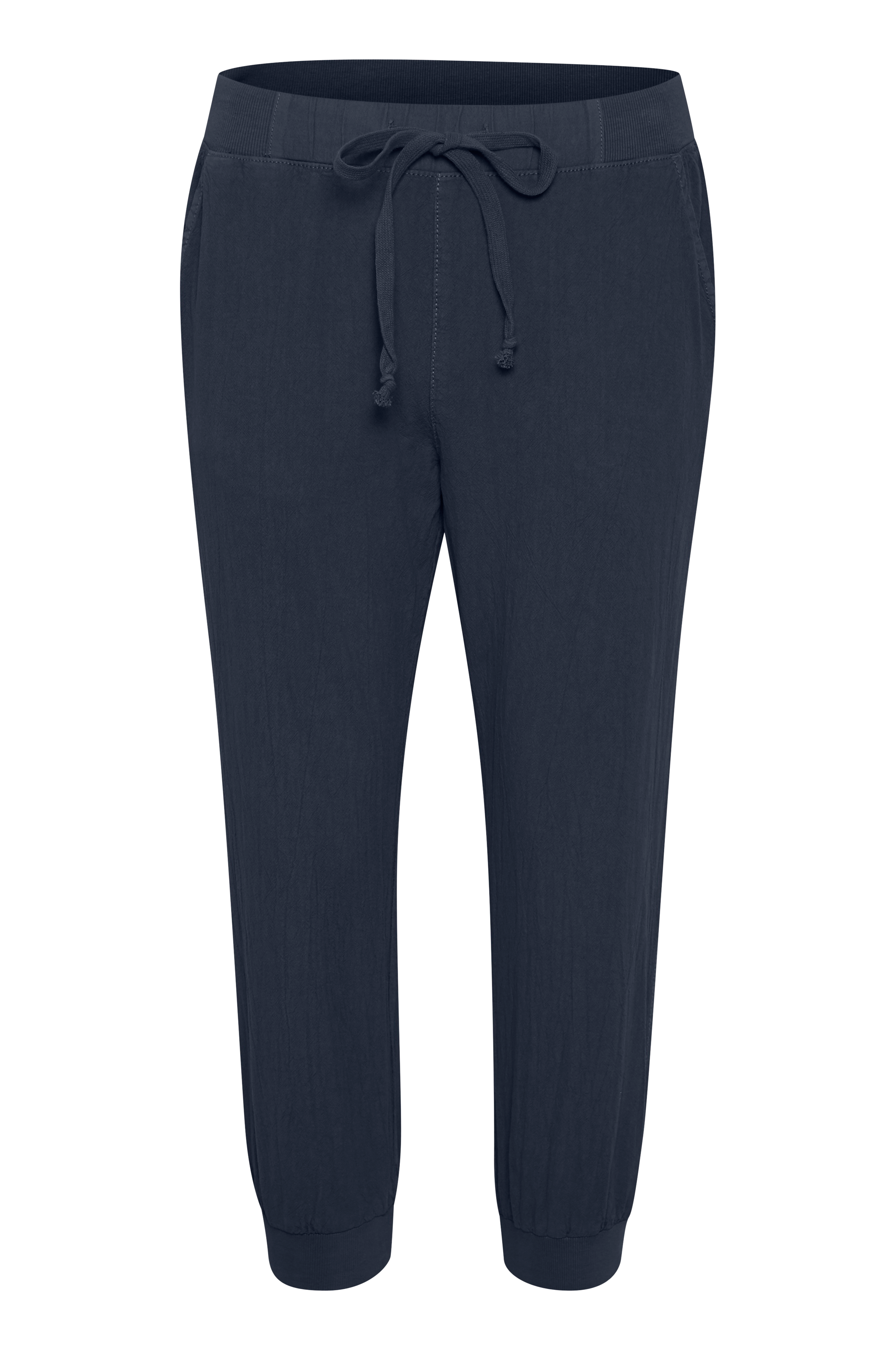 Model med afslappet form og lige ben som slutter på læggen med ribkant. Ribstrikket linning med indsat elastik og løbegang samt to stiklommer foran. Benlængde ca. 57 cm i str. 36.