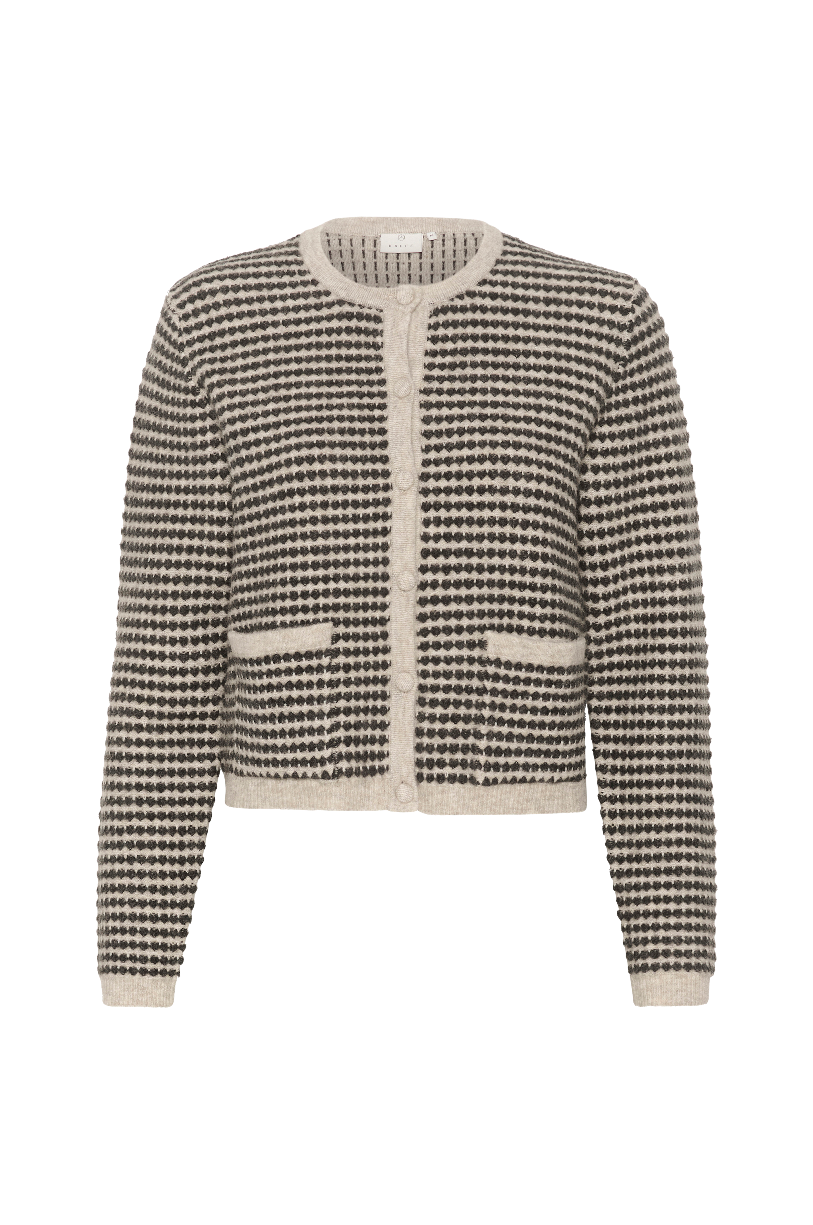 • Lige, mønsterstrikket model• Rund hals• Beklædte knapper• Langt ærme• Lommer• Ribstrikkede kanter