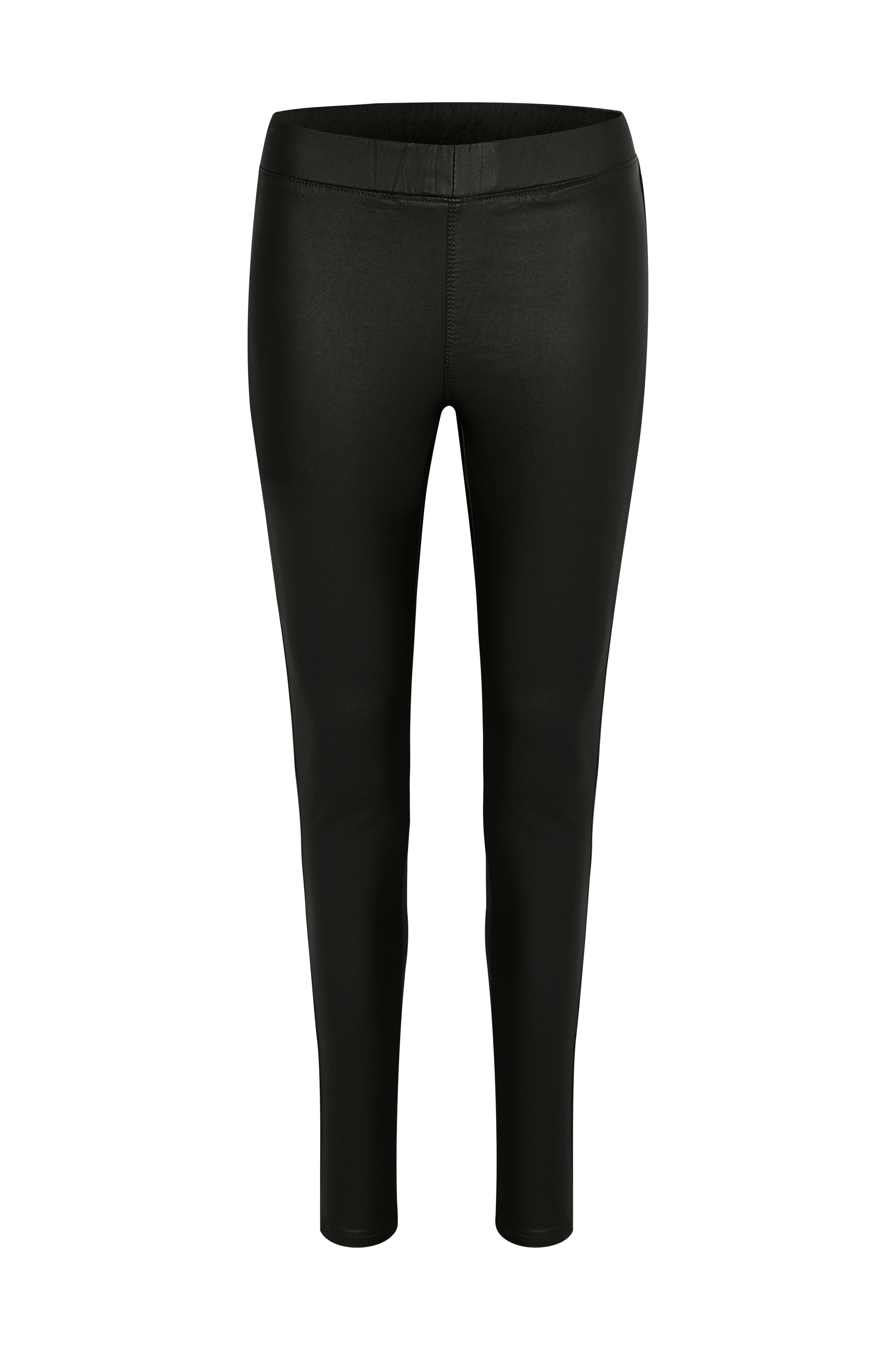 Jeggings Ada Coated fra Kaffe i stretchkvalitet med coated (vokset) overflade. Slim fit. Elastisk linning. Benlængde ca. 80 cm i str. 36.