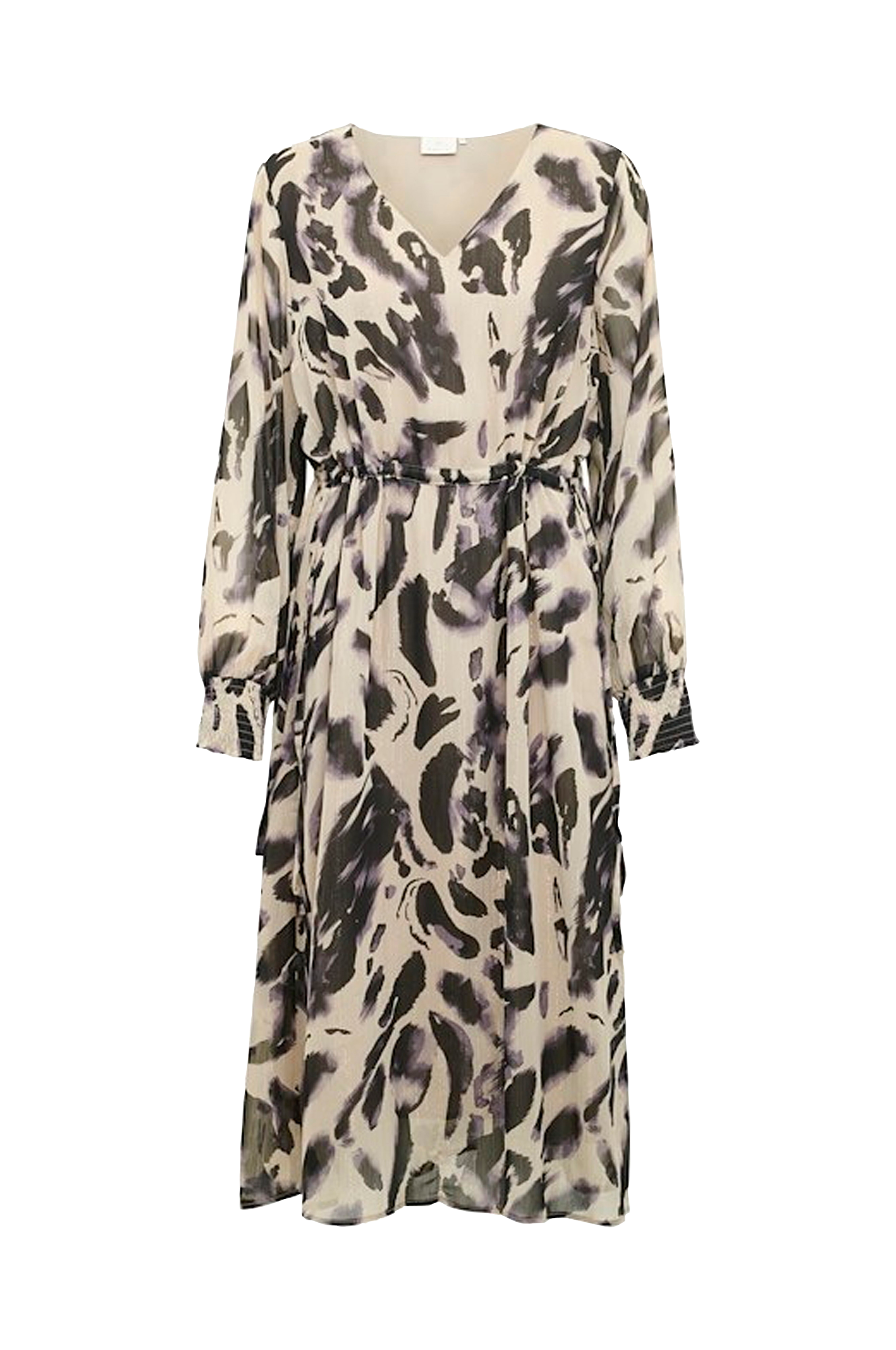 • Model med svaj i chiffon med sølvagtige striber• V-formet halsudskæring• Langt ærme med smock ved manchetterne• Træksnørre ved taljen med bindbart bånd i siderne• Foret• Længde: 119 cm i størrelse 36