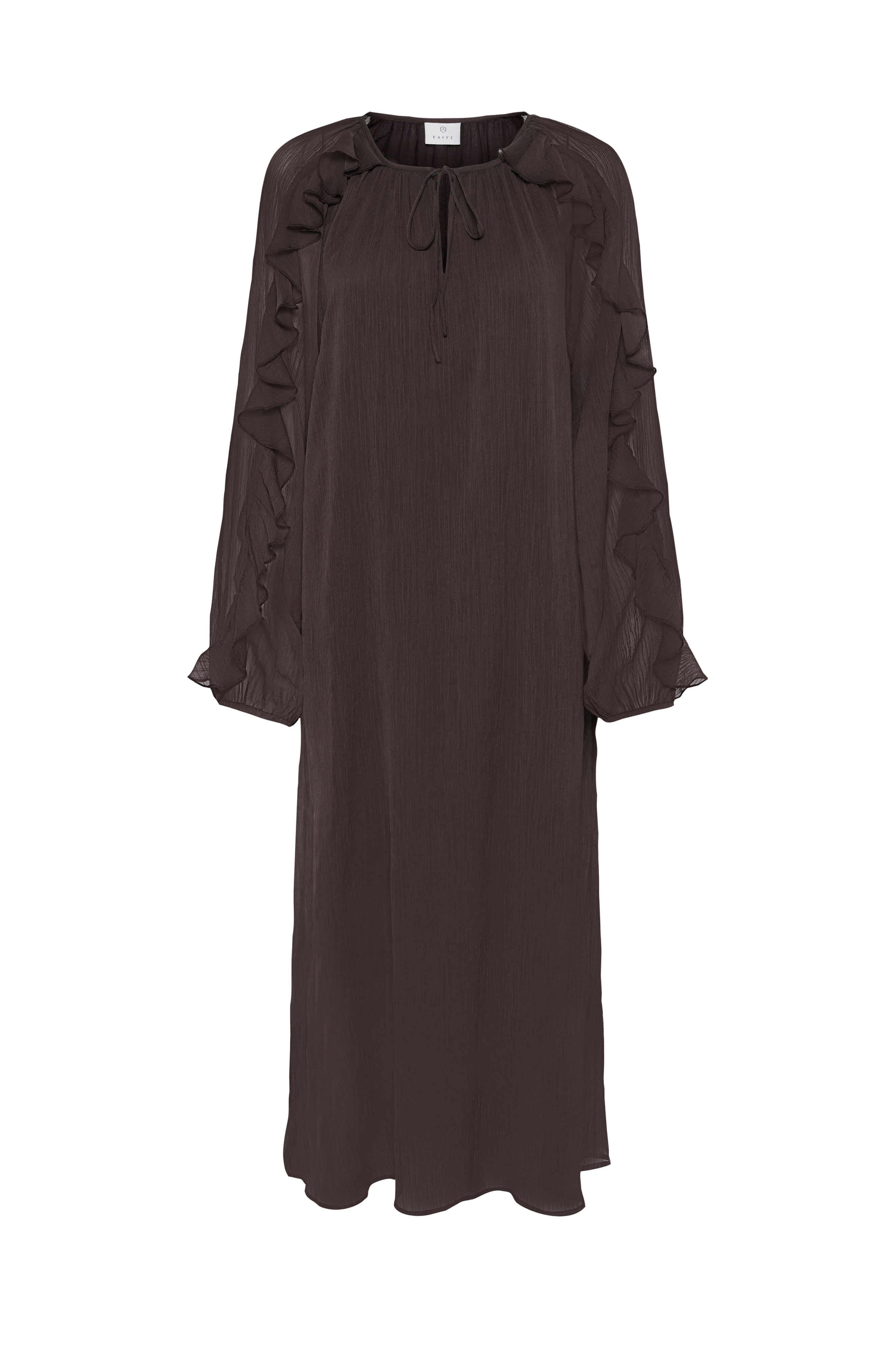 • Tynd, foret kjole i chiffon• Rund halsudskæring• Slids med bindebånd på halsen• Lange ærmer med volant langs siderne• Model med svaj• Længde: 127 cm i størrelse 36