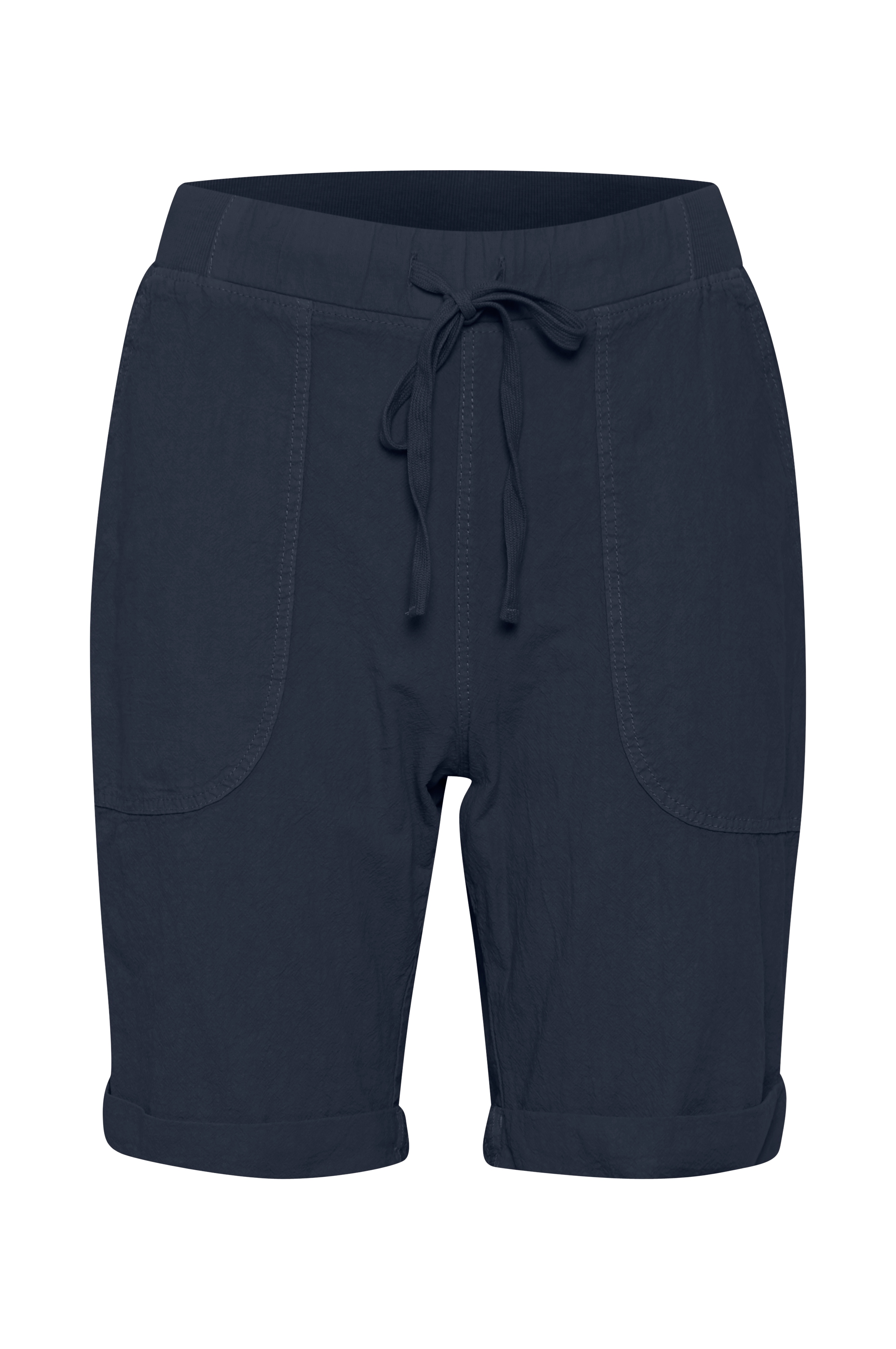 Shorts i vævet kvalitet med lige ben som har fast opslag i benkant. Ribstrikket linning som er glat foran og har indsat elastik samt løbegang. To store, påsyede forlommer. Indvendig benlængde ca. 21 cm i str. 36.