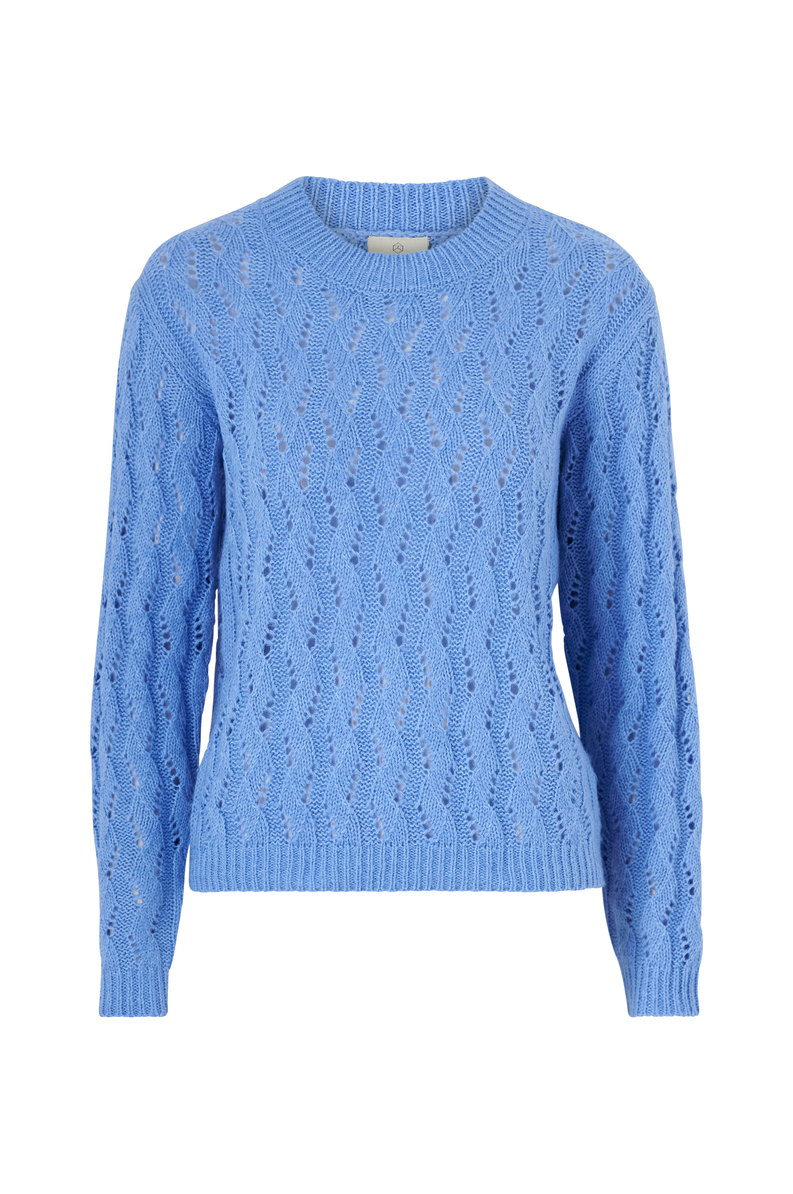 • Mønsterstrikket model• Rund hals med ribstrik• Langt ærme• Ribstrikkede kanter ved manchetterne og nederst