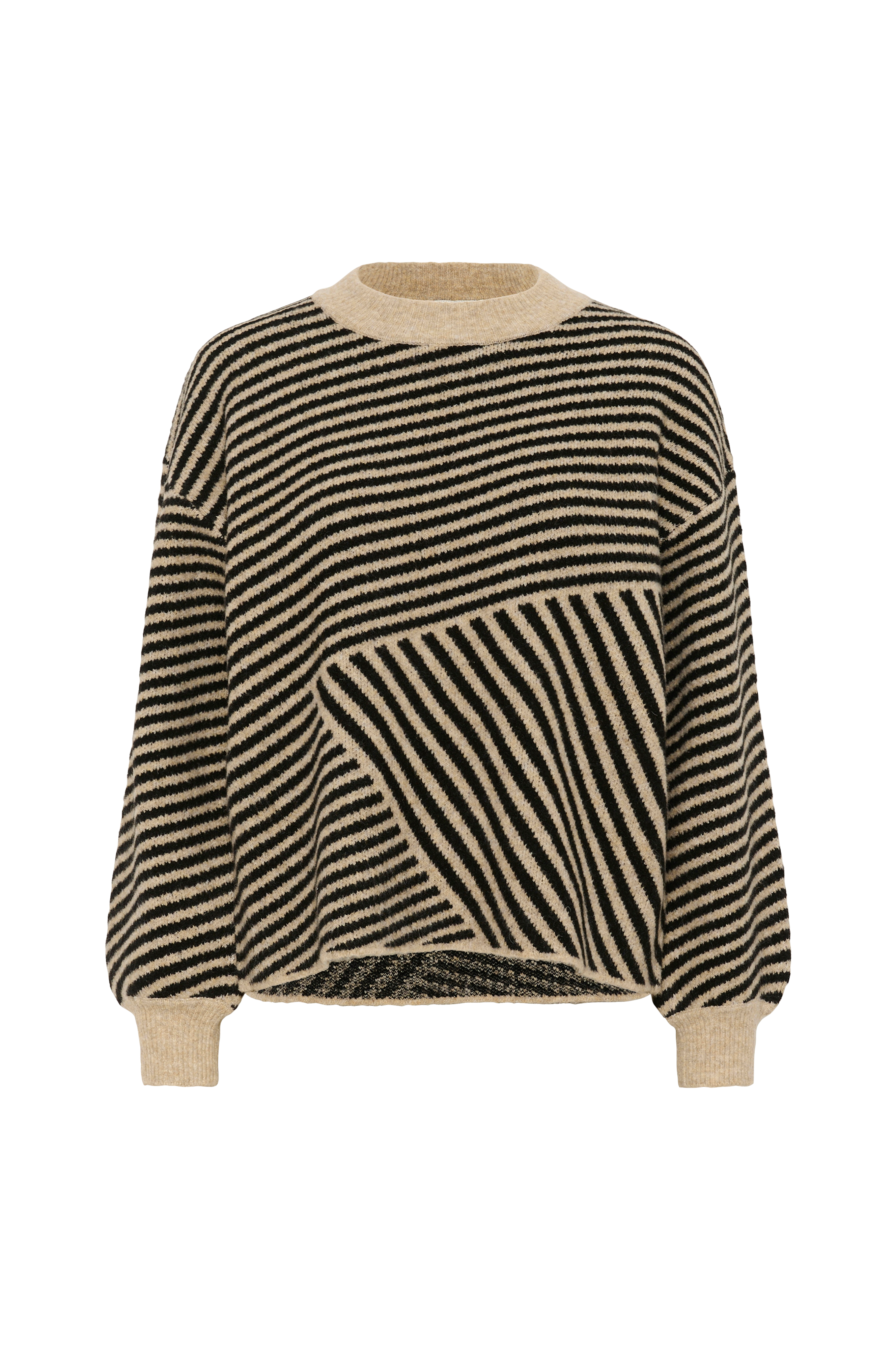 • Bred, lige model med strikkede striber• Rund, ribstrikket halsudskæring• Nedsænket skulder• Langt ærme med ribmanchet