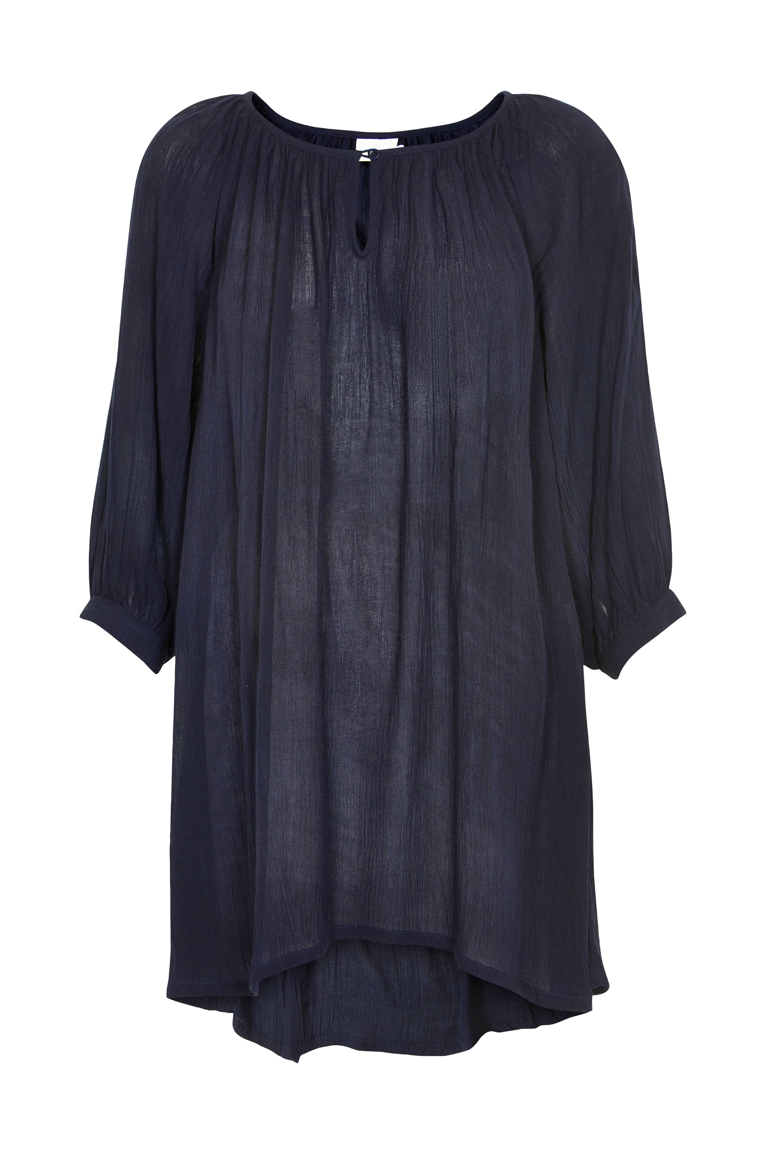 Tunika Amber Tunic fra Kaffe i løs, A-formet model med vide 3/4-lange ærmer med manchet og knap i ærmekant. Rund hals med slids og knap foran. I vævet, crepet kvalitet. Længde ca. 89 cm i str. 36.