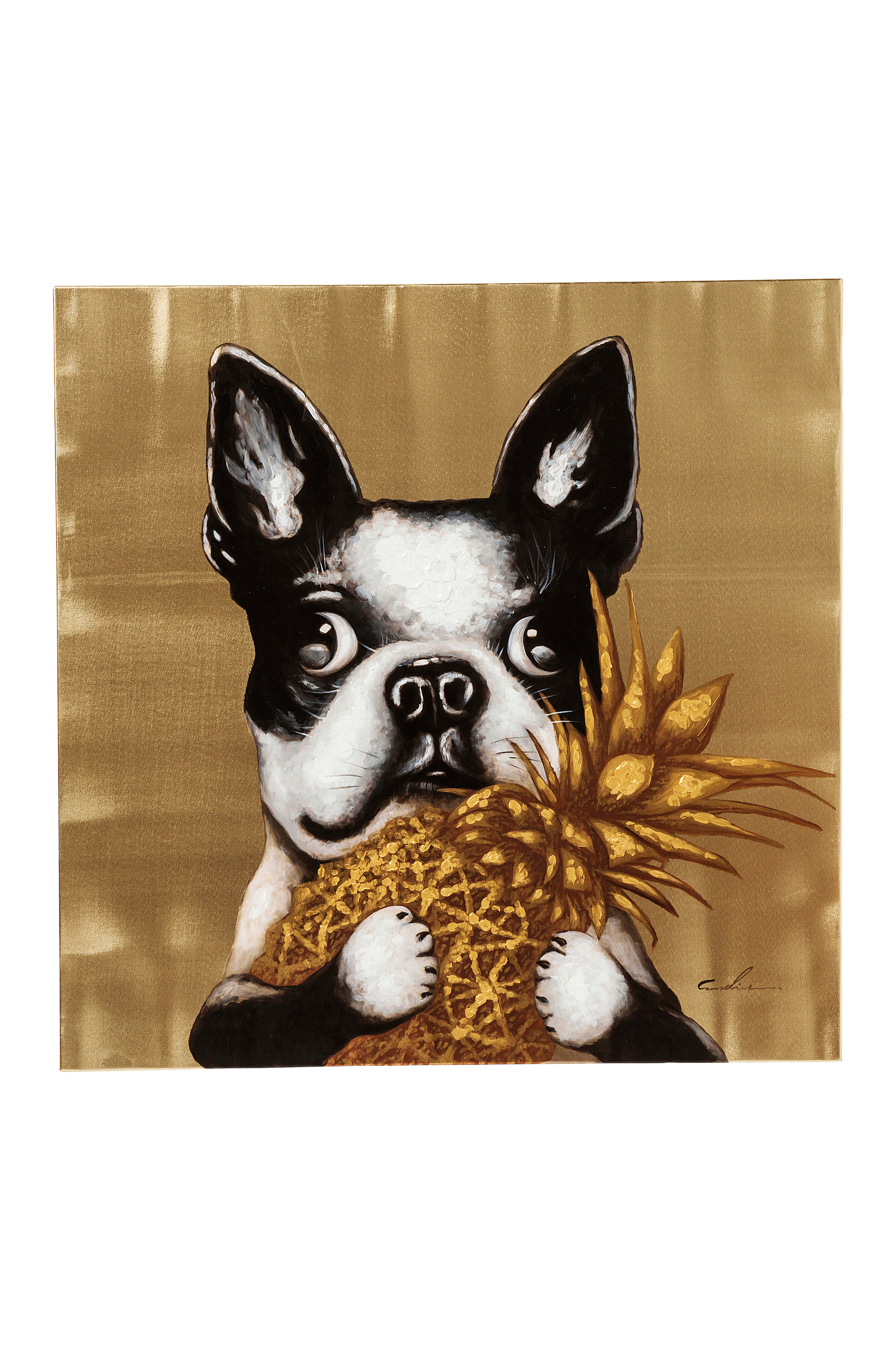 Et fabelagtigt billede. Den søde dog i sort og hvid skiller sig ud fra den gyldne baggrund. Det lille kæledyr fortryller with en gylden pineapple i sine poter. Detaljerne er delvist håndmalede og gør hvert billede unikt.