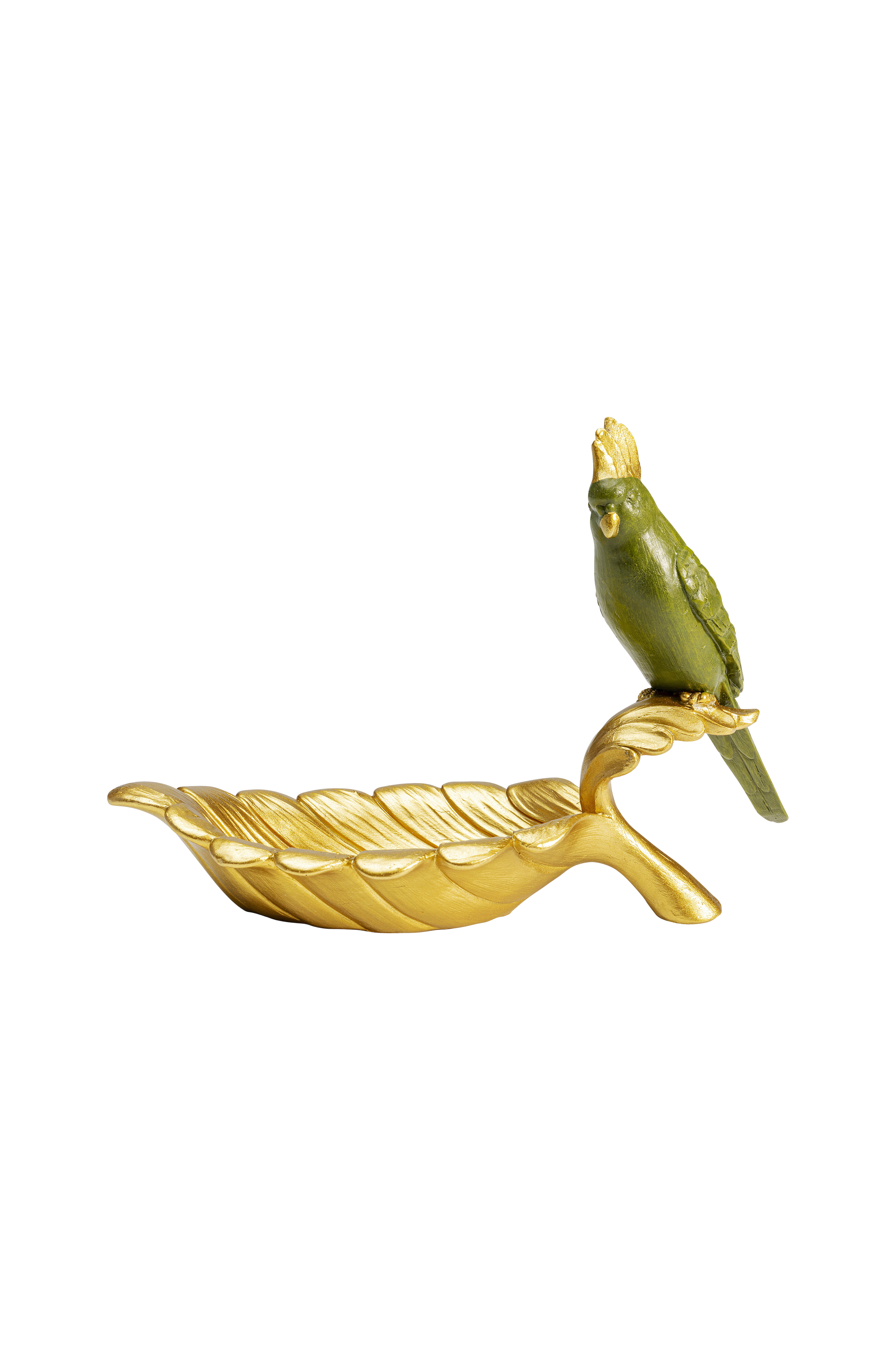 Den tropiske fugl vogter opmærksomt over skattene i den gyldne skål. parrot guard dekorationsskålen er med sit elegante design en gylden showstopper. lavet af kunststen og malet i hånden er hvert stykke unikt. den detaljerede fugl og de naturtro imiterede blade danner en visuelt tiltalende enhed. fyldt med indpakket slik er det attraktive dekorationsobjekt også ideelt til at præsentere som en gave.