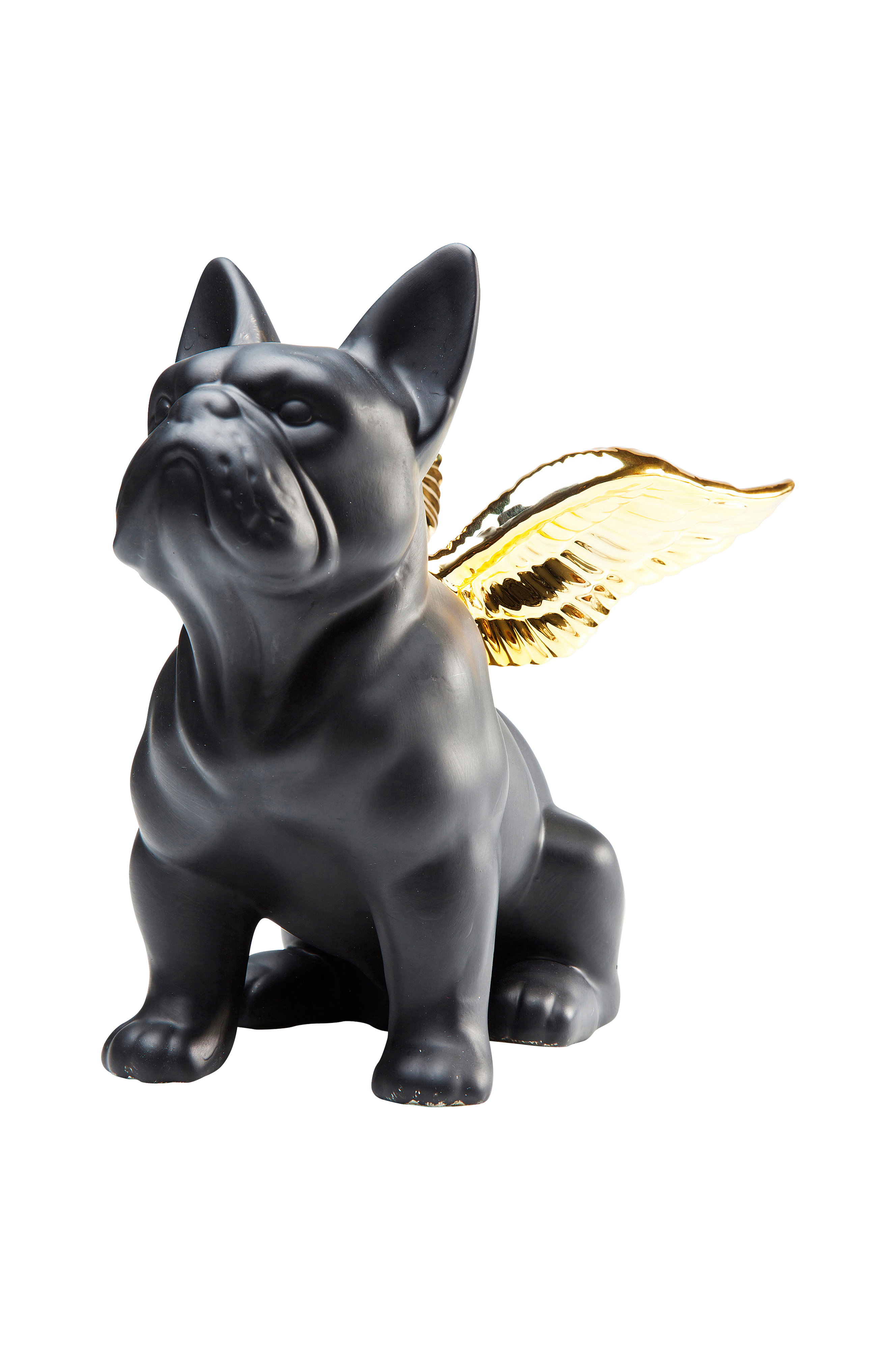 Den er detaljeret udført, så man kan se ansigtsudtryk og naturalistiske detaljer på den yndige hundefigur. Den matte sort skaber interessante lyseffekter på den dekorative figurs muskuløse krop, og de skinnende gyldne vinger danner en iøjnefaldende og speciel kontrast. Den sorte og gyldne skulptur af stentøj/keramik vejer omkring 700 gram og står lige så solidt på et fint sidebord som på en hylde eller kommode. Fans af boston terrier, bull terrier og fransk bulldog skal være opmærksomme - dette er et dekorativt must-have. Og en gaveidé, der med garanti vil glæde dog fans.