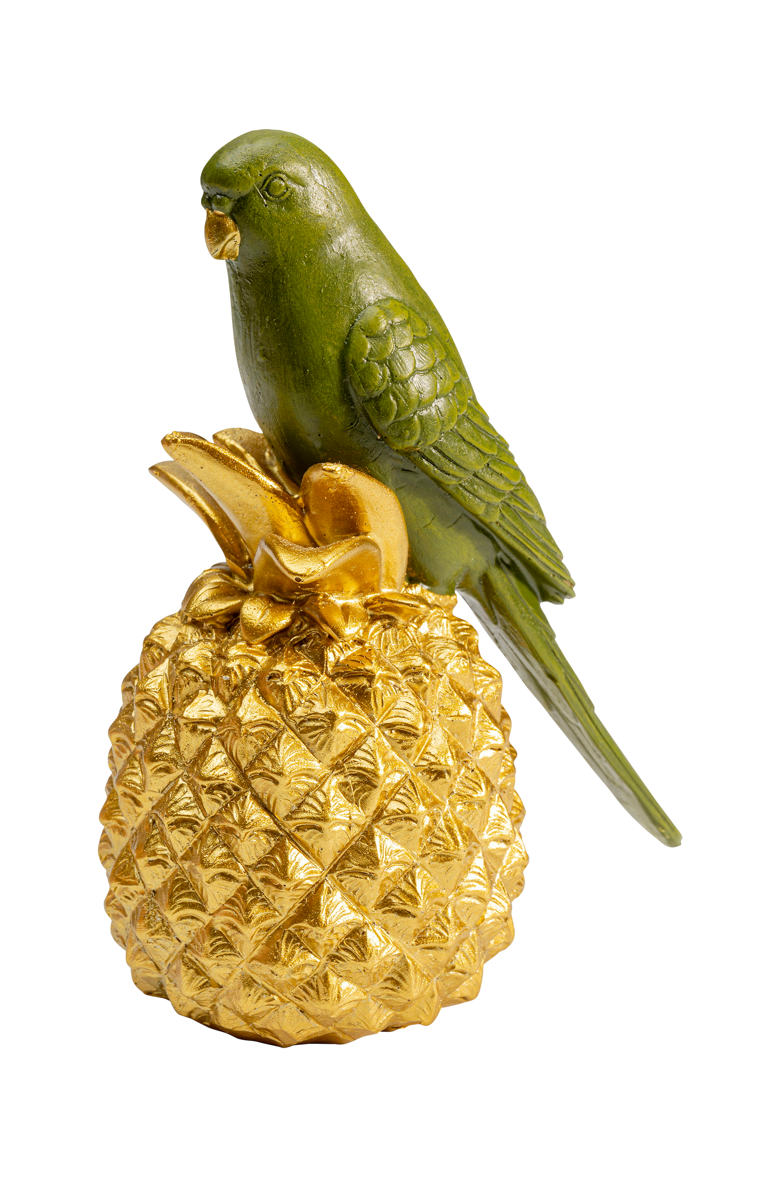 Denne dekorative figur giver dig den tropiske følelse! Sæt noget musik på, forkæl dig selv med en lækker cocktail, og nyd et par solstråler i dit hjem. Denne dekorative figur passer perfekt på baren eller i stuen på en hylde eller skænk med et par planter, og du har allerede givet dit hjem en opgradering. Den gyldne ananas med den grønne parrot, der sidder på den, er et flot blikfang til soveværelset, stuen eller ved indgangen i gangen. Dette håndmalede og unikke tilbehør tilføjer helt sikkert et strejf af latinamerikansk livlighed til dit hjem.