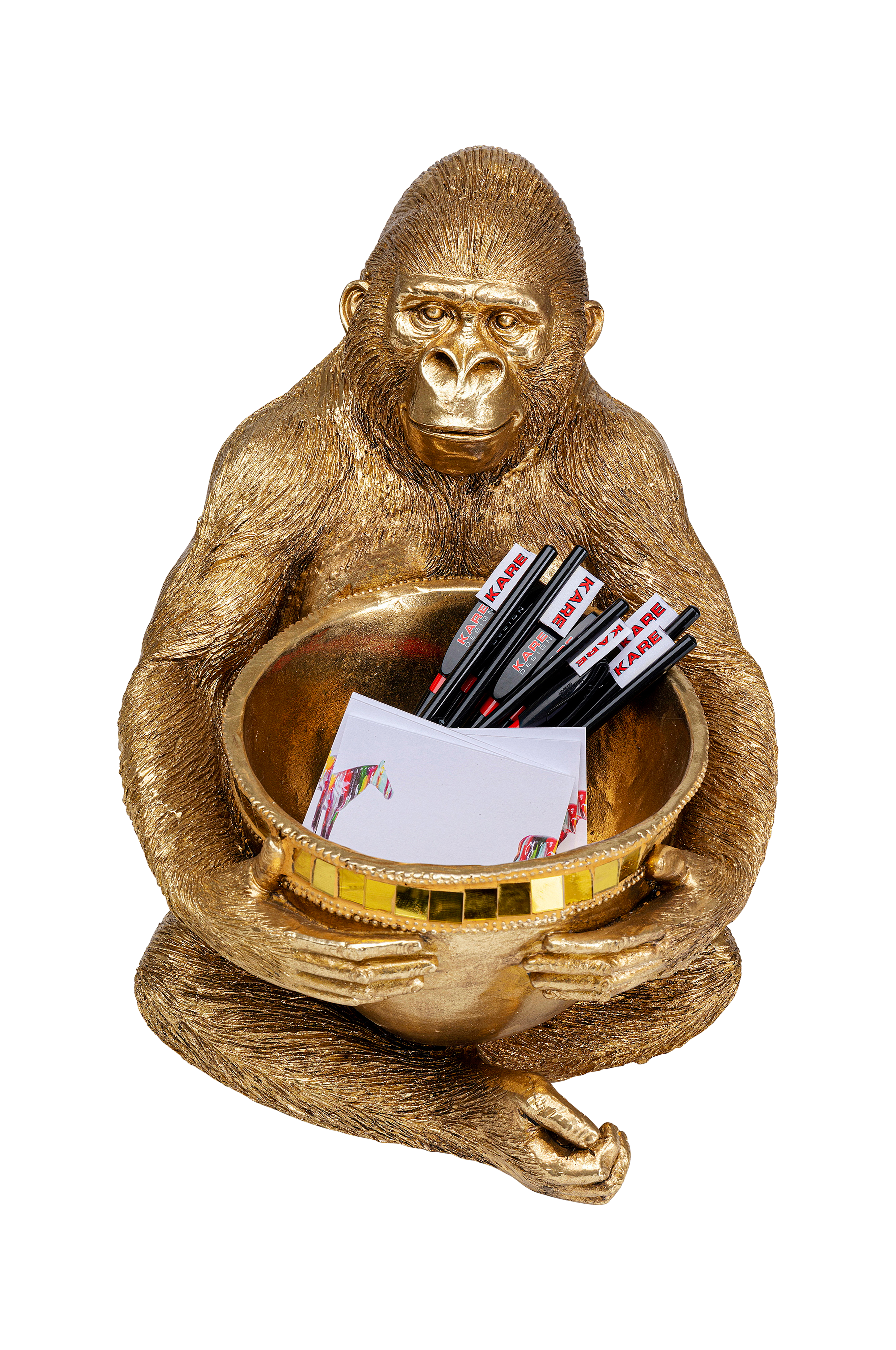 Denne strålende smukke gorilla er utroligt detaljerig. Den glinsende pels og praktiske skål i guldfarve giver glamour til hvert hjørne af din bolig. Et must for alle fans med sans for orden og humor! Fremstillet af polyresin.