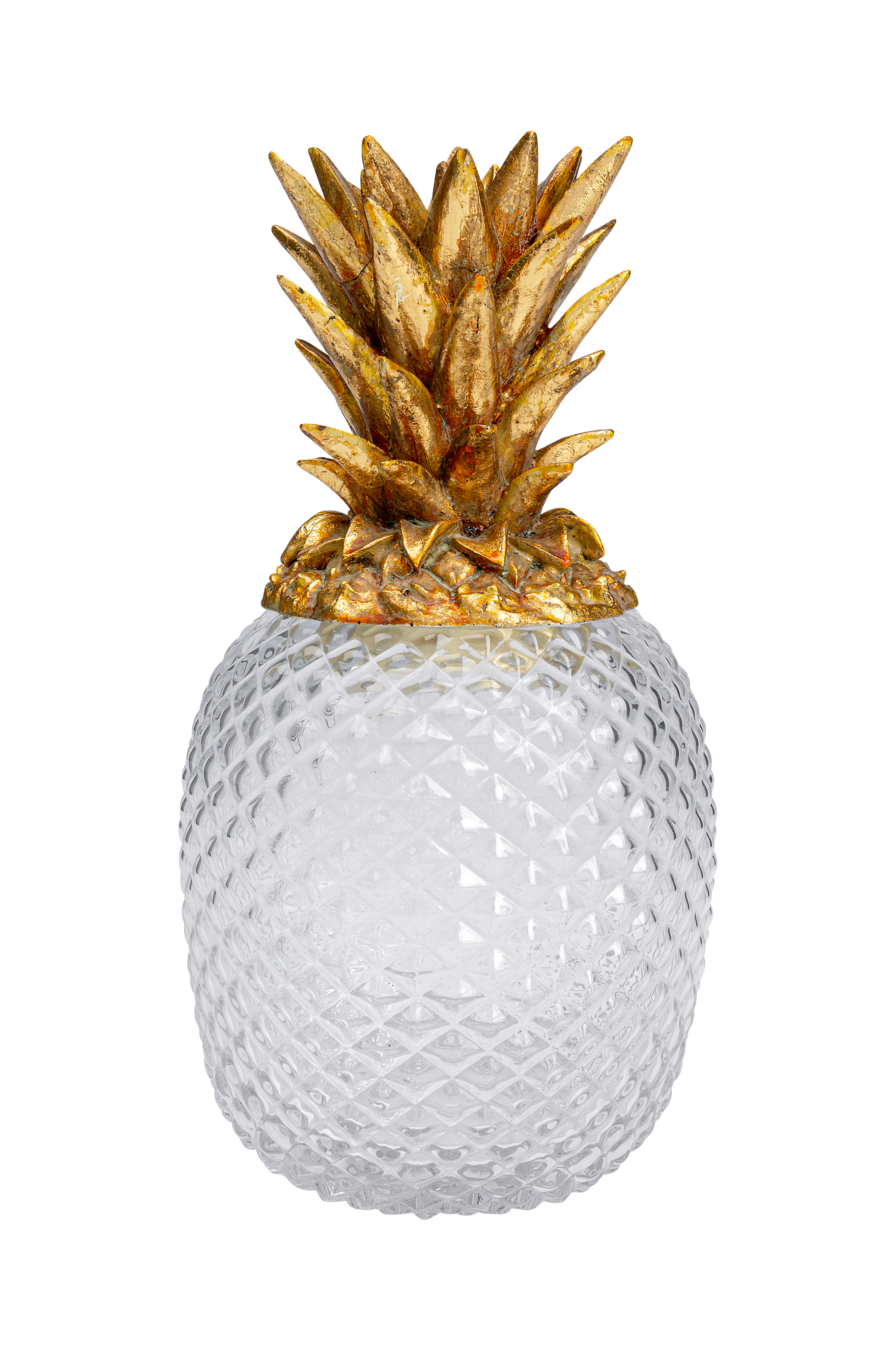Ananasen er blevet en absolut favorit i boligindretningen. Dette eksemplar med gyldent låg viser indholdet, da beholderen er let gennemsigtig. En vitaminbombe til dekorative arrangementer og bestemt en god gaveide. Fremstillet af glas og polyresin.