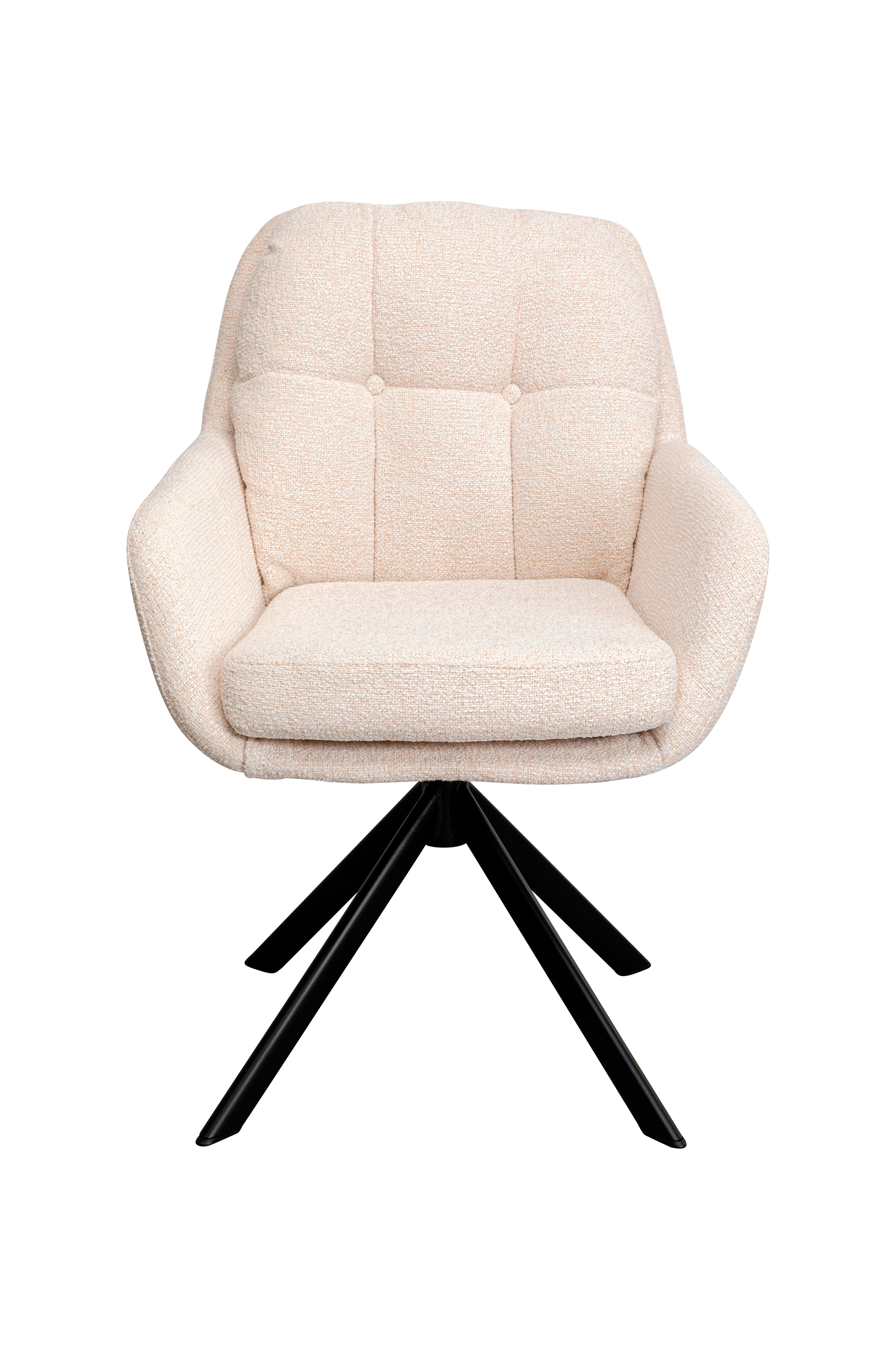 Vores drejestol med armlæn i stilfuld cremehvid kombinerer komfort og elegance. Den bløde polstring sikrer, at man sidder behageligt, mens drejefunktionen giver mere fleksibilitet ved spisebordet. Ideel til lange aftener med familie og gæster. Det tidløse design passer perfekt til moderne og klassisk indretning. Den praktiske returfunktion på den 180-graders drejelige base er værd at fremhæve. Et elegant møbel, der forbedrer spisepladsen og garanterer maksimal siddekomfort. Perfekt til det stilbevidste interiør!