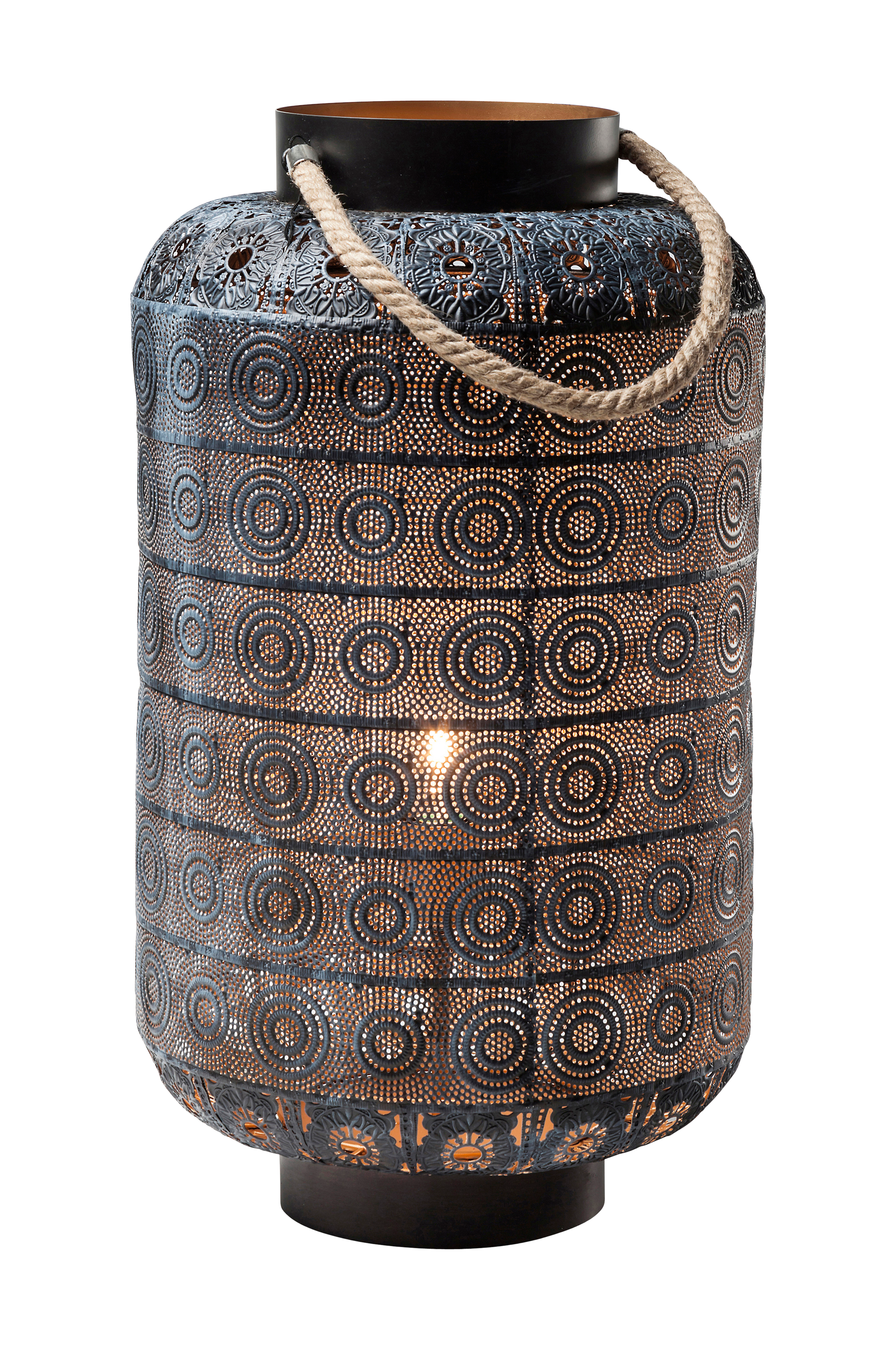 To i en. En smukt dekoreret lampe i orientalsk stil. Stellet er smukt gennembrudt og er elegant udsmykket i en lygtelignende form. Håndtag af sisal. Findes i andre versioner.
