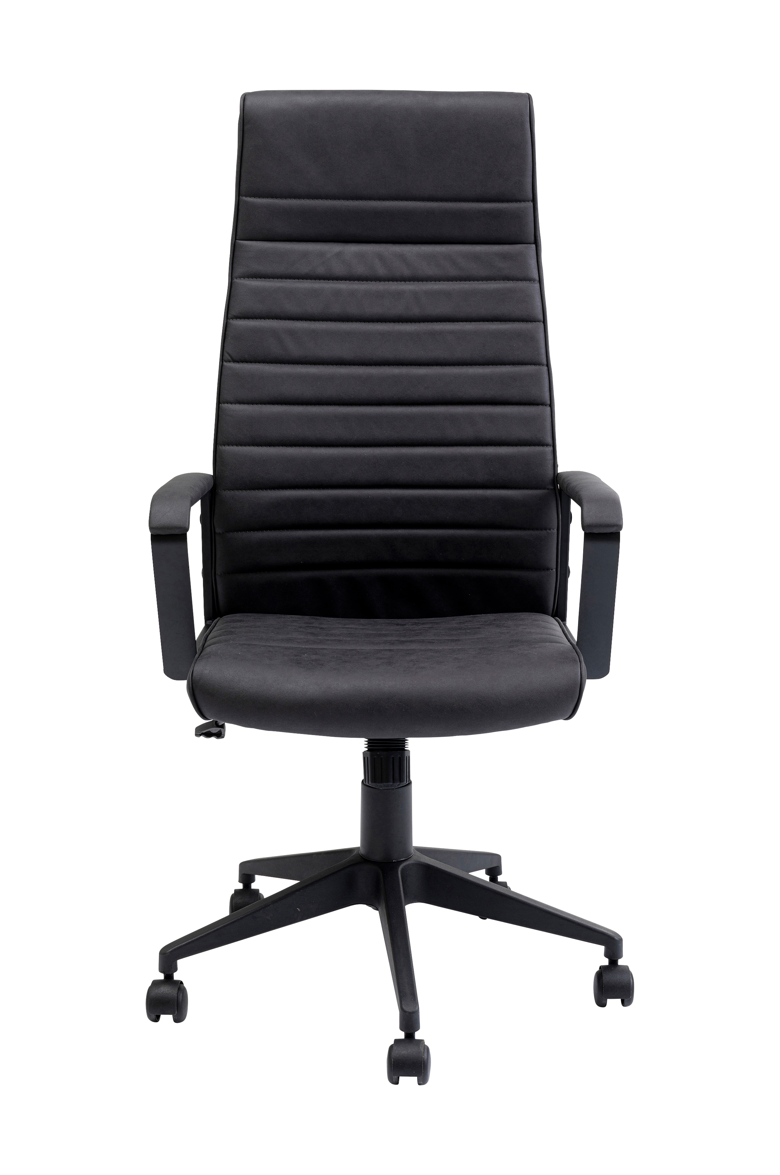 Drej rundt! Den høje kontorstol Labora i sort med drejefunktion og polstret sæde imponerer med sine funktioner: den roterer, kan vippes og justeres i højden. Derudover har Labora et ekstra højt ryglæn, et tidløst smukt design og et slidstærkt læderlignende betræk med vintage-look. Modstanden i ryglænets vippemekanisme kan justeres individuelt, så det passer til din kropsbygning. Denne stilfulde favorit på kontoret ruller jævnt på fem hjul af høj kvalitet. Denne kontorstol gør arbejdet meget sjovere! Leveres usamlet.