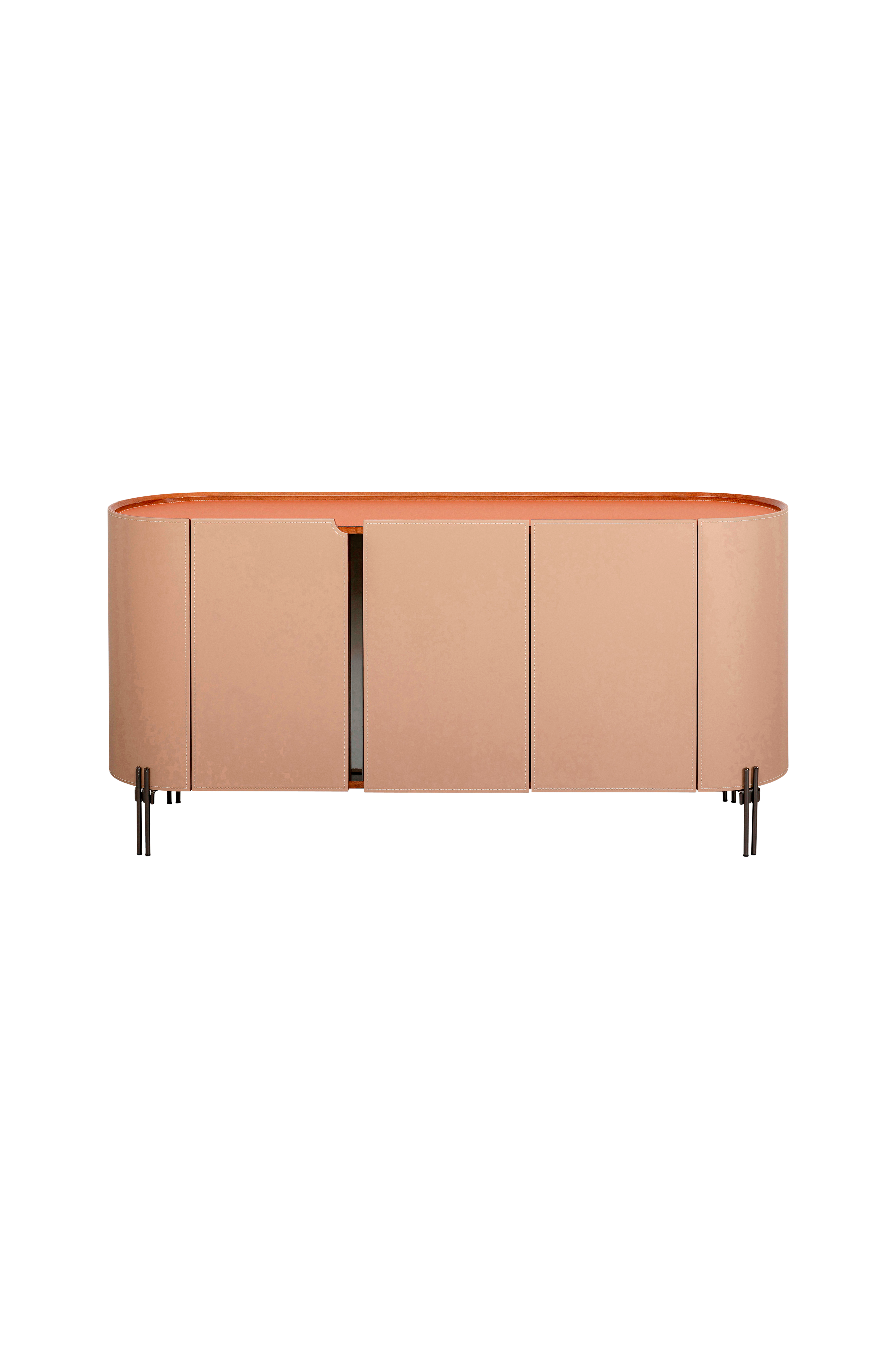 Hvis du er på udkig efter en mindre skænk, kan denne model med en bredde på 150 cm være det perfekte svar. Designet fokuserer på neutrale farver og et harmonisk look med afrundede ender. Toppen, som også er polstret i en kontrastfarve, er lige så sigende for dette tv-møbels designfinesse som den smalle front med det tonede, reflekterende glas. Sidst, men ikke mindst, fremhæver dørene uden håndtag det rene og elegante udseende af dette designermøbel fra kare. Bag de tre låger er der faste hylder indvendigt, som gør det nemt at opbevare mange ting.