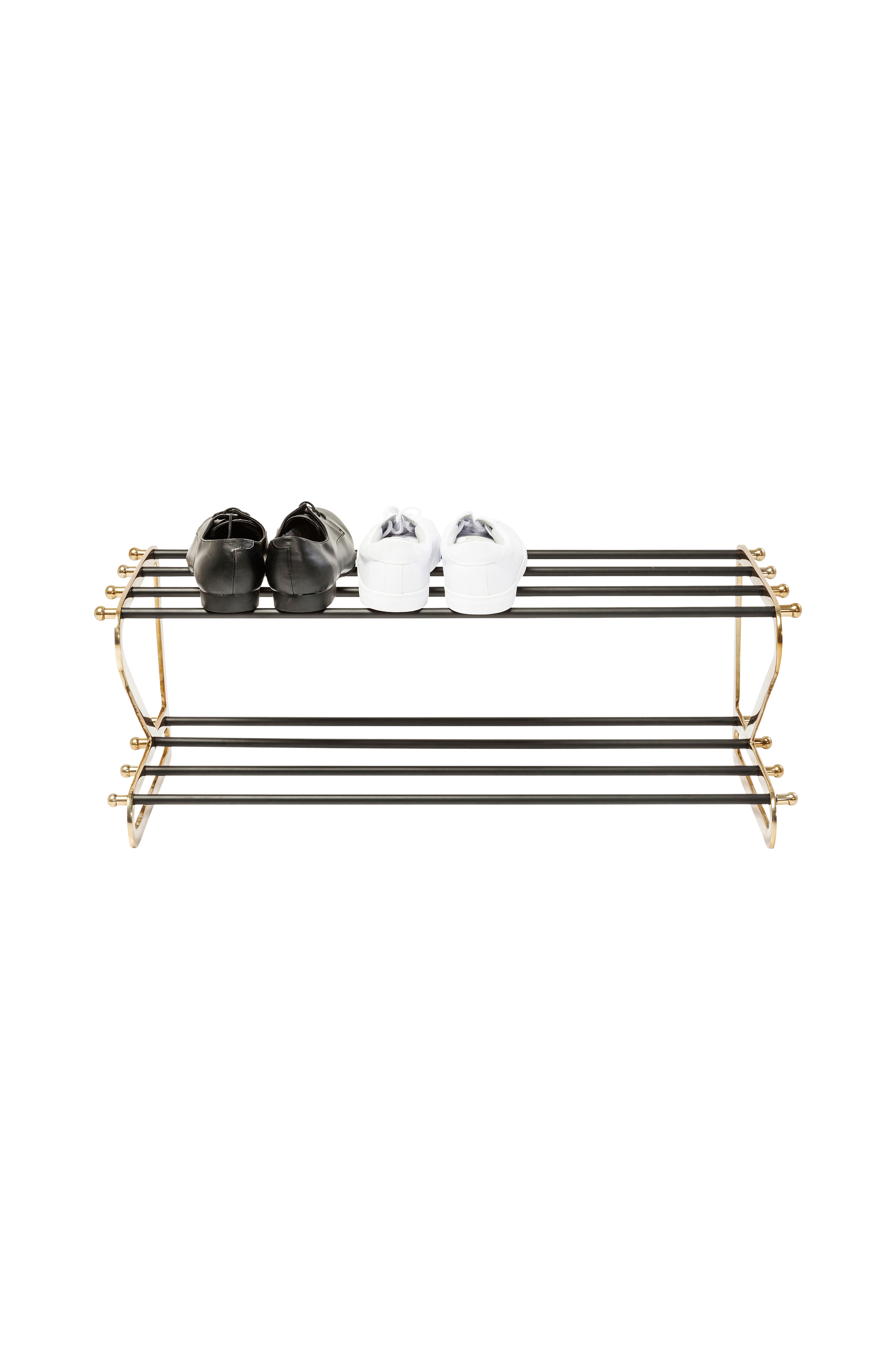 Et alsidigt skostativ, der også kan bruges som sidebord, hylde eller avisholder. Skostativet med to hylder har en imponerende ramme i guldfarve og runde, sortlakerede stænger.