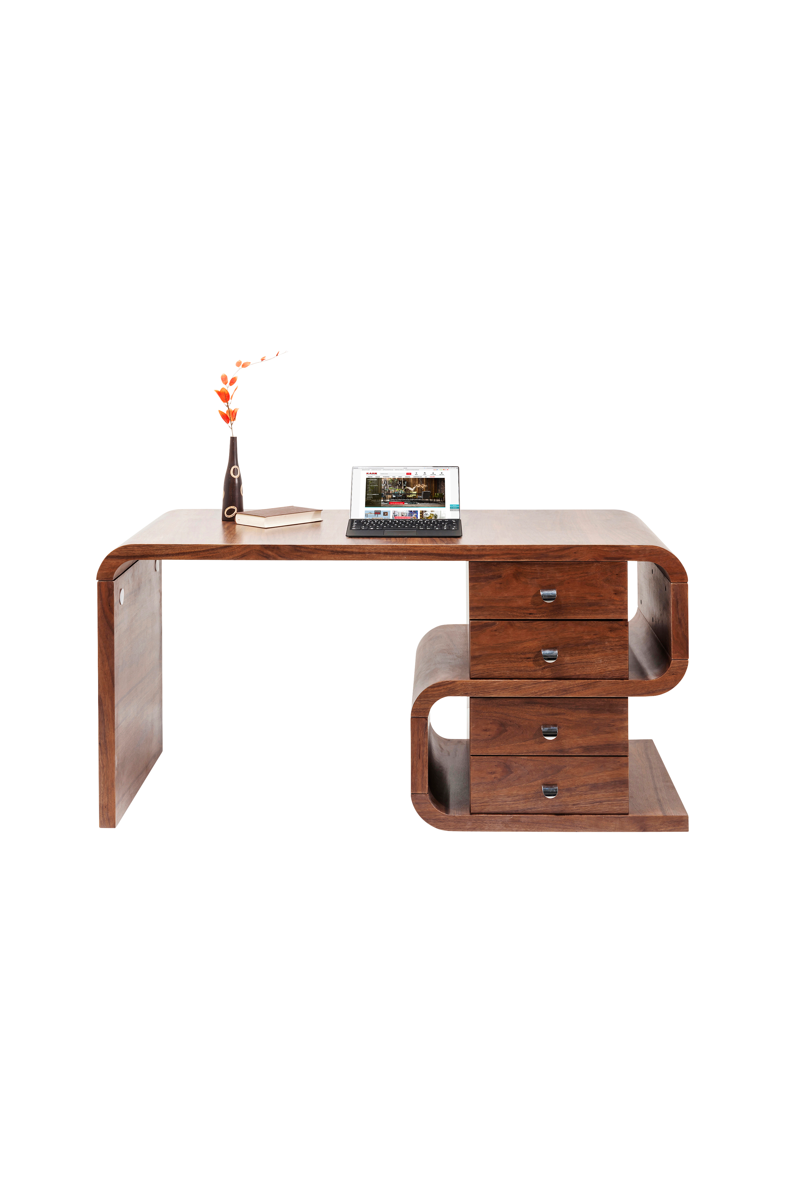Skrivebord Snake i valnød er et skrivebord med en design udover det sædvanlige! Skrivebordet er både retro og elegant med blandingen af valnød og blanke forkromede håndtag. Fire skuffer med skrivebordsopbevaring. Materiale: MDF beklædt med finér i valnød, forkromede håndtag i stål.