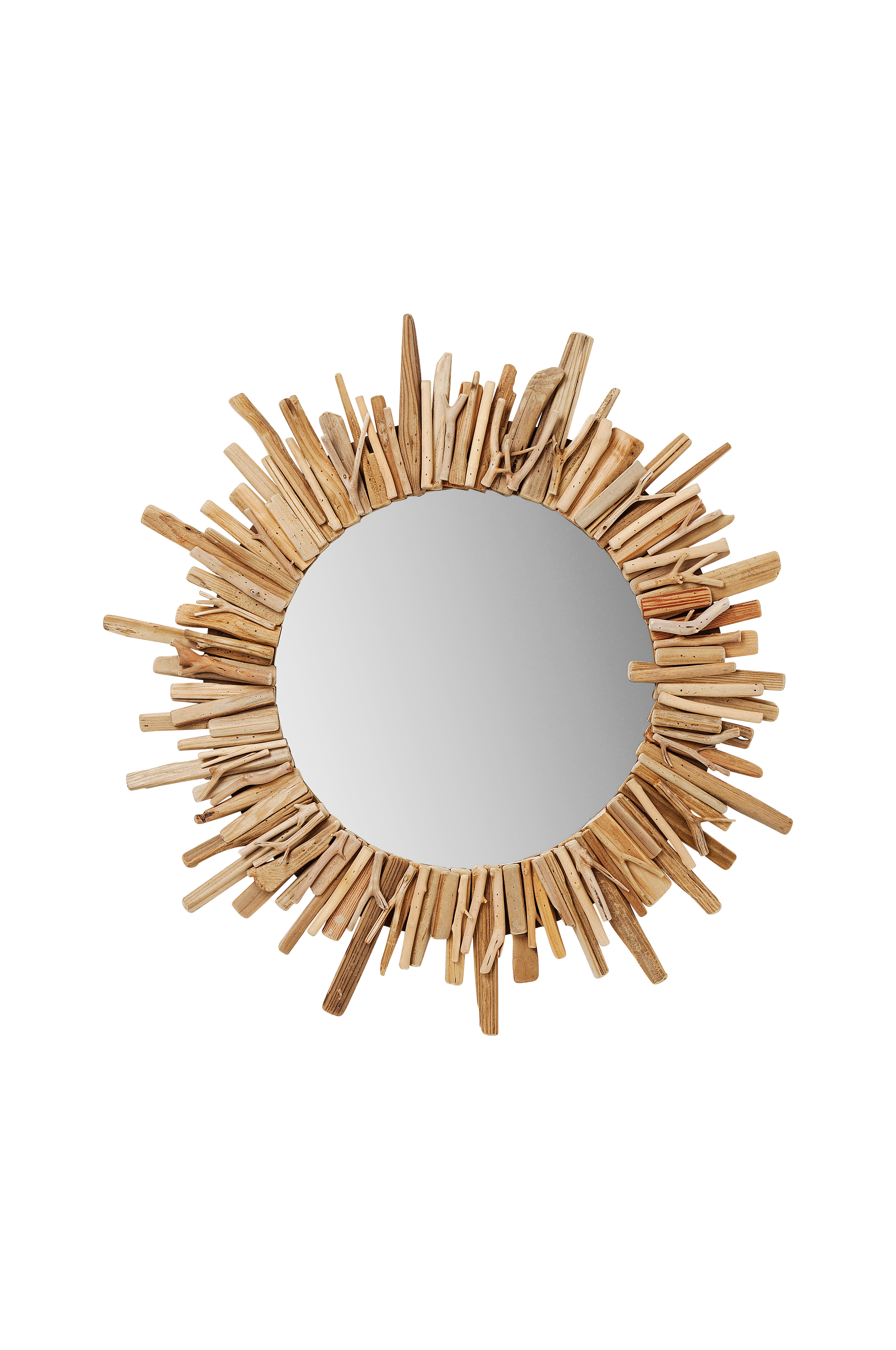 Her kan du atter se, hvor anvendeligt teamwork er, når design og natur stråler sammen - det kreative resultat er et solformet spejl med ramme, eller nærmere en krans, af træstænger og grene. Naturmateriale er så tjekket!