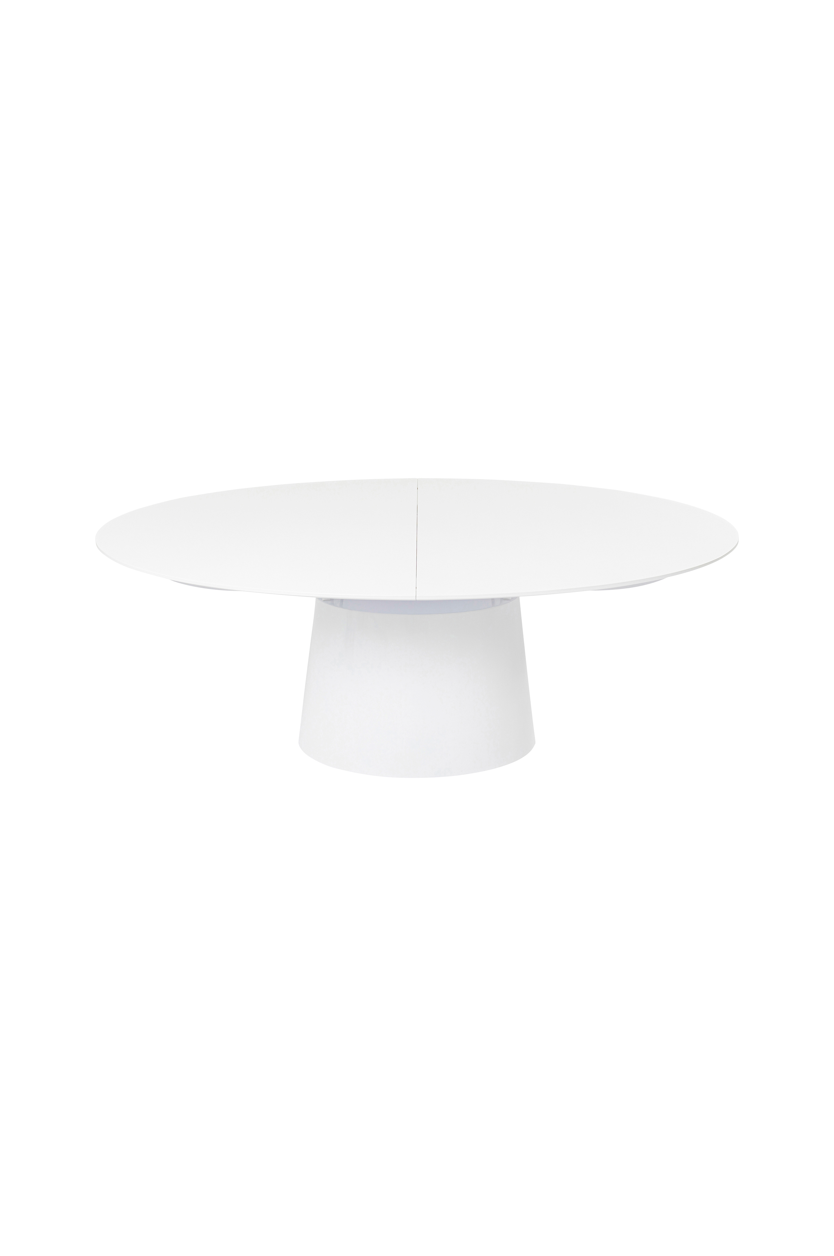 Elegance og funktion. Dette elliptisk formede spisebord kombinerer funktion med design. Kan forlænges 200-250 cm. Bordpladen er 3 cm tyk. Materiale: MDF, hvidlakeret højglans. Leveres usamlet.