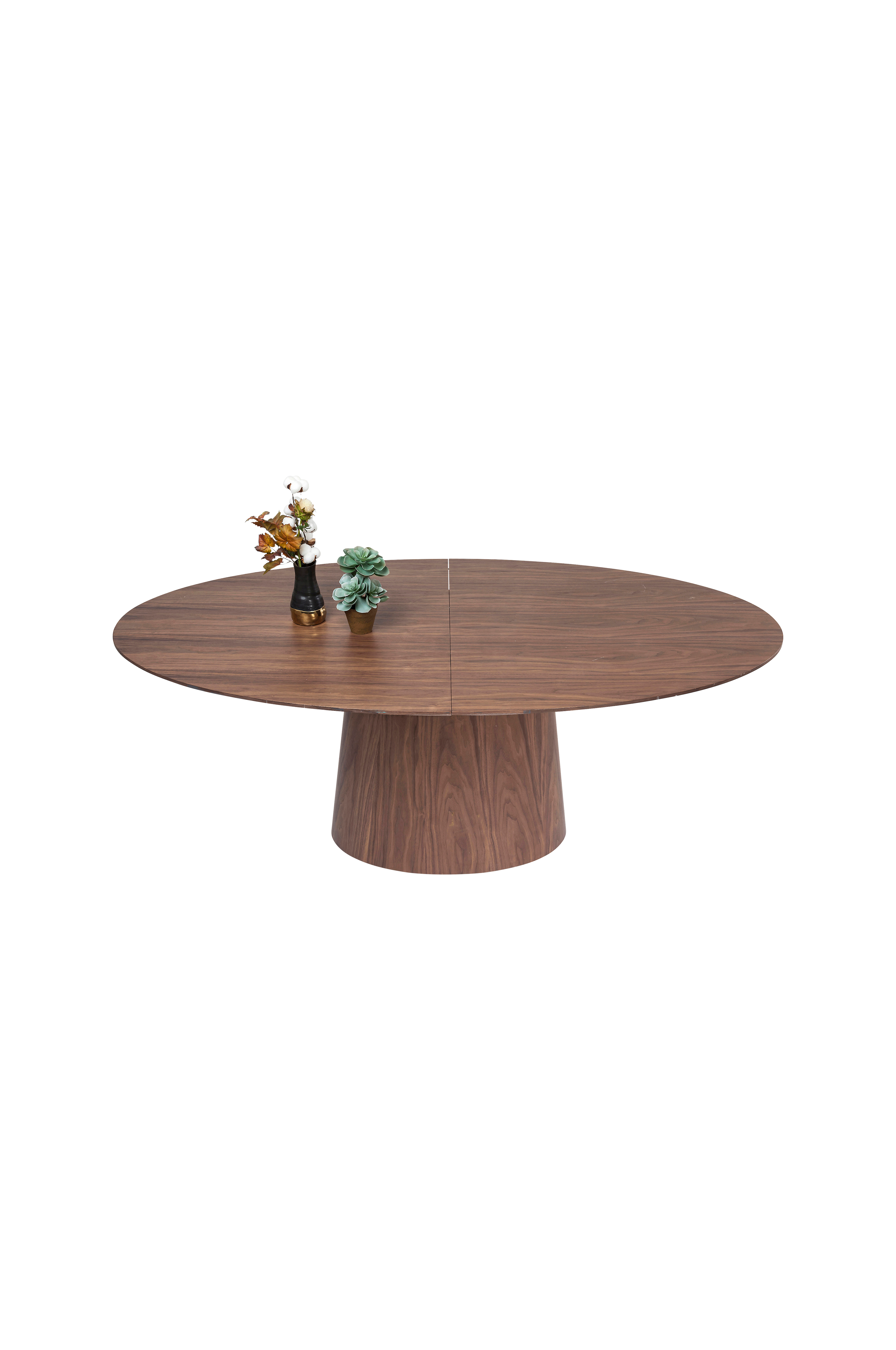 Elegance og funktion. Dette elliptisk formede spisebord kombinerer funktion med design. Kan forlænges 200-250 cm. Bordpladen er 3 cm tyk. Materiale: MDF, brun valnødfinér. Leveres usamlet.