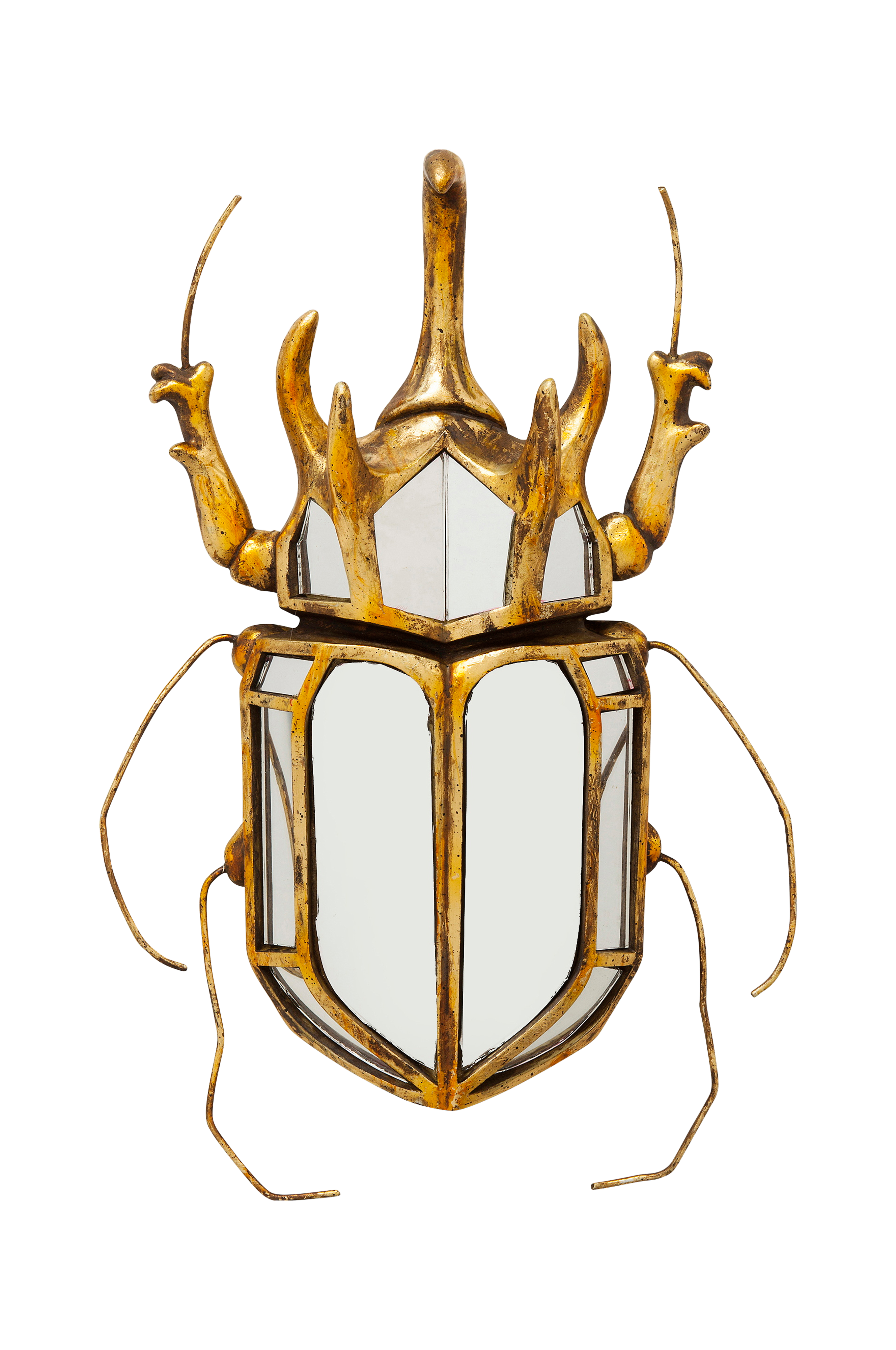 Et smukt spejl i form af en bille, der med garanti vil være et blikfang på enhver væg. Spejlglasset i kombination med den guldfarvede ramme giver denne håndlavede vægdekoration en raffineret stil. Passer perfekt ind i både moderne og klassiske indretninger. Denne dekoration er et must, hvis du elsker urban jungle-stilen. Vægdekorationen bliver ekstra imponerende i kombination med andre spejle fra samme kollektion. Fremstillet af spejlglas og plast.