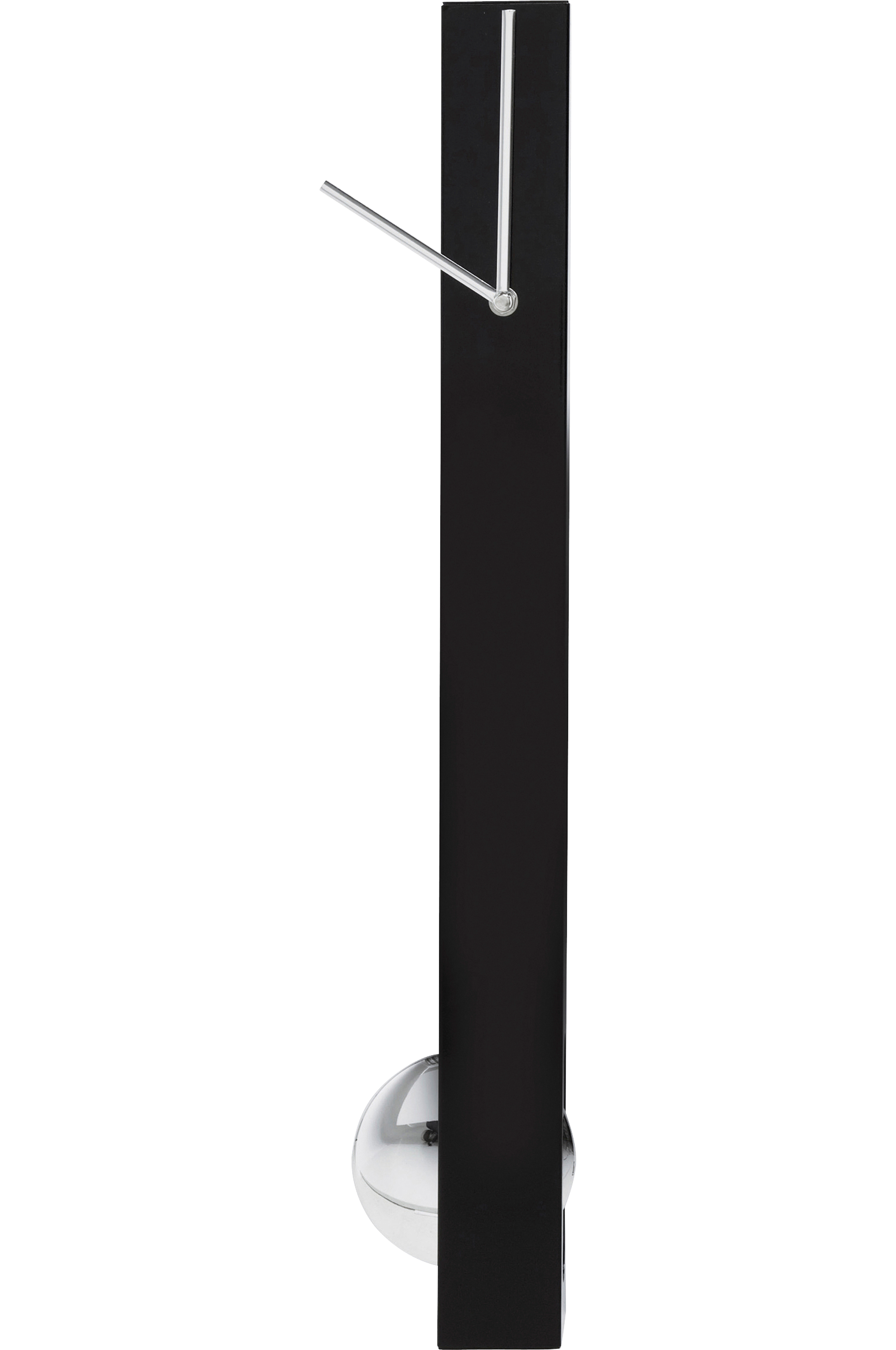 Moderne ur med pendul - uret Pendel viser på autoritær vis, at ure ikke altid behøver at være runde. Den smalle, elegante urskive i sort står oprejst, som et monument. Når viserne peger opad, svinger et rundt pendul i skinnende krom i bunden og skaber en slående effekt! Moderne, elegant design kombineret med et stramt touch. En vellykket kombination. Til alle der kan lide en moderne, ren stil.