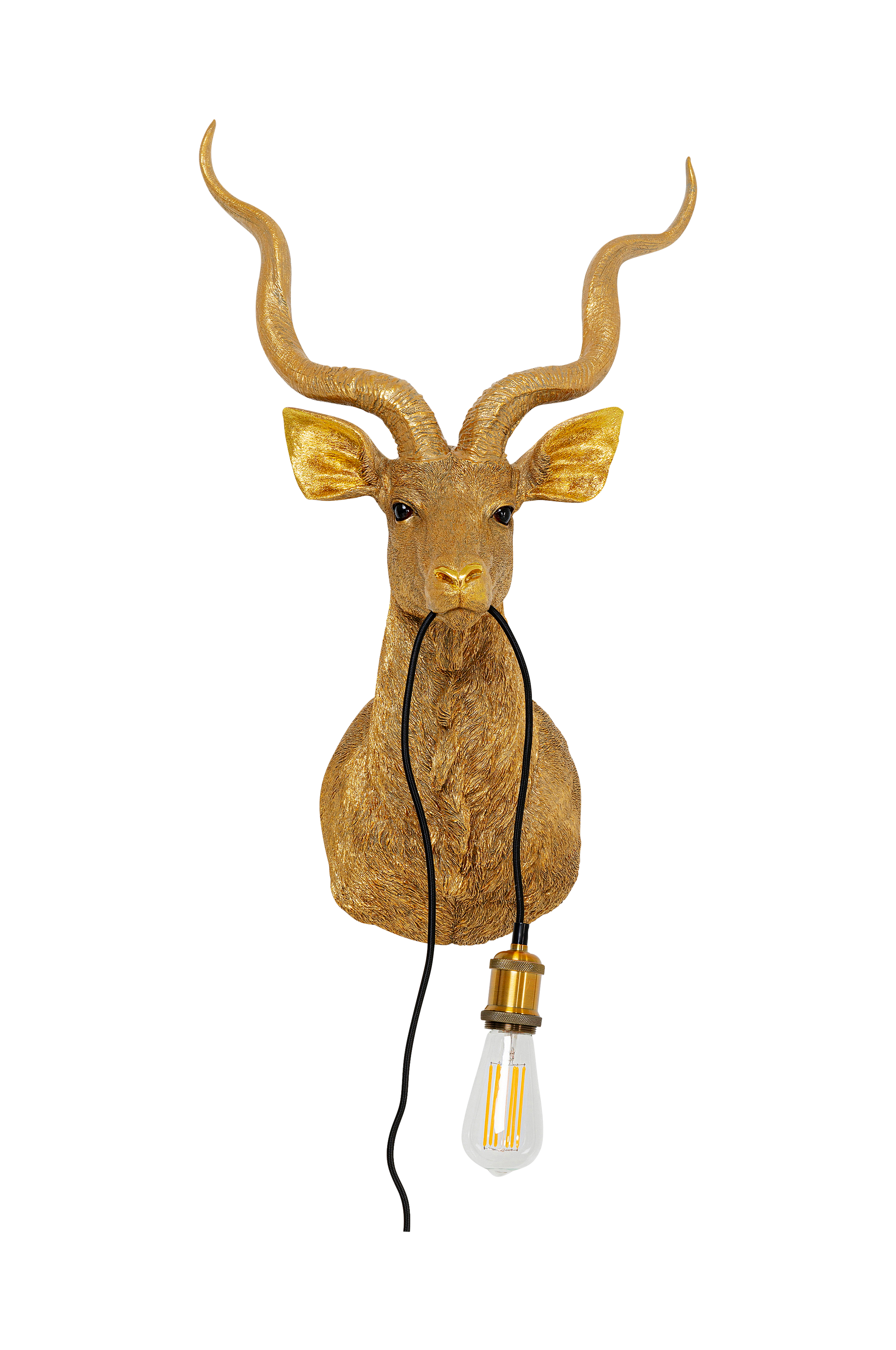 Et hyggeligt hjem har brug for dekorative genstande og dekorative lamper. De fungerer som smykker som gør rummets stil perfekt. Denne lampe kombinerer charmen ved en kreativ og dekorativ genstand med en stemningsfuld væglampes funktion. Derudover er dette antilopehoved den mest dyrevenlige udgave af et trofæ - lavet udelukkende af støbt sten og lakeret i guldfarve. En anden fordel ved denne væglampe er, at der ikke skal trækkes kabler ind i væggen, en nærliggende stikkontakt er alt hvad du behøver. Fremstillet af polyresin.