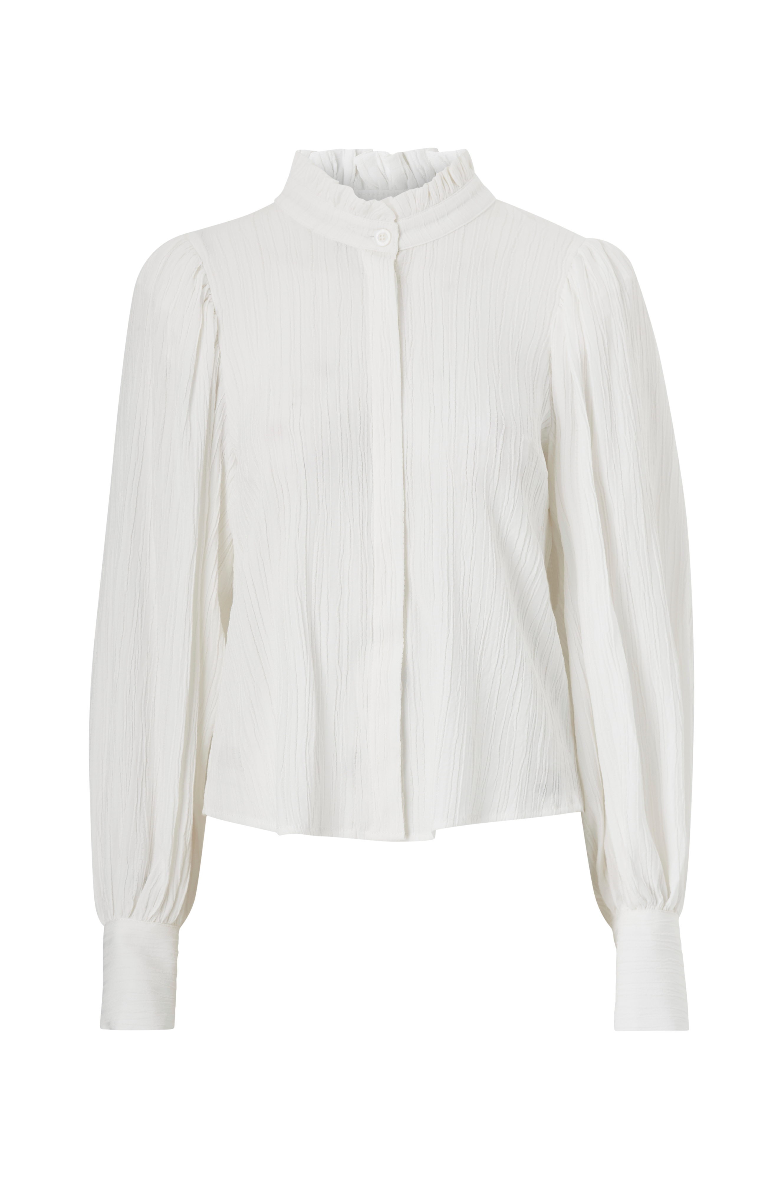 • Mønstervævet model• Rund hals med lille volant• Knapstolpe med skjulte knapper hele vejen frem• Ekstra bredt ballonærme med manchet