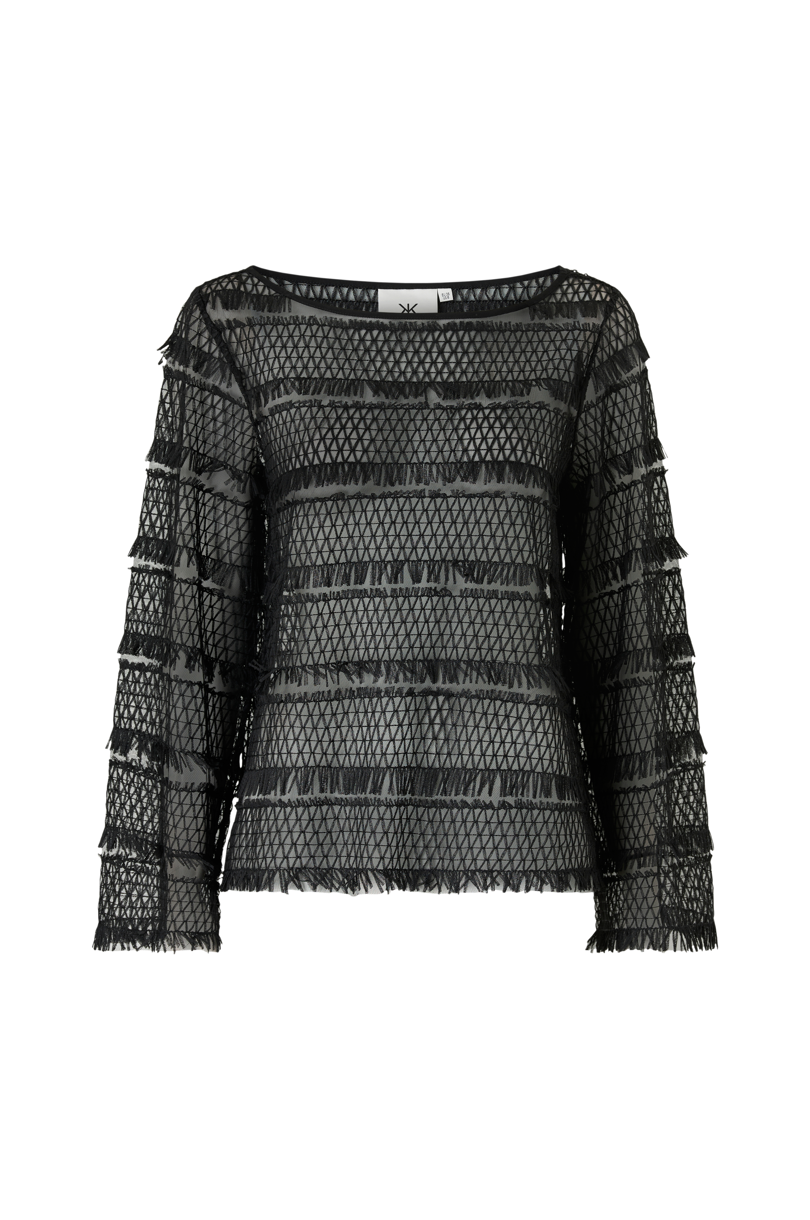 • Transparent bluse i mesh med frynsedetaljer hele vejen rundt• Bådhals• Lange, brede ærmer
