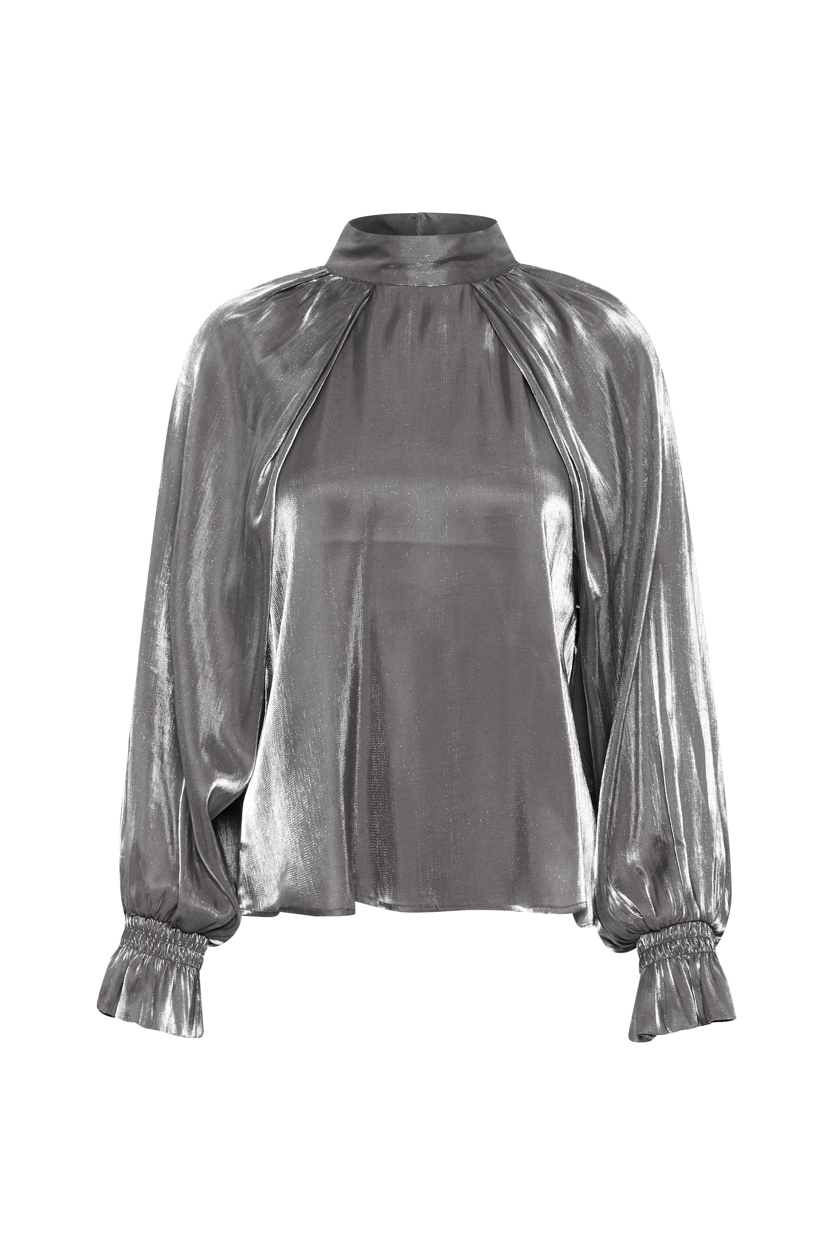 • Langærmet bluse i skinnende, glitrende materiale• Nedsænket skulder• Ballonærme med smock• Høj halsudskæring med åbning i nakken med knapper• Rynkedetalje foran