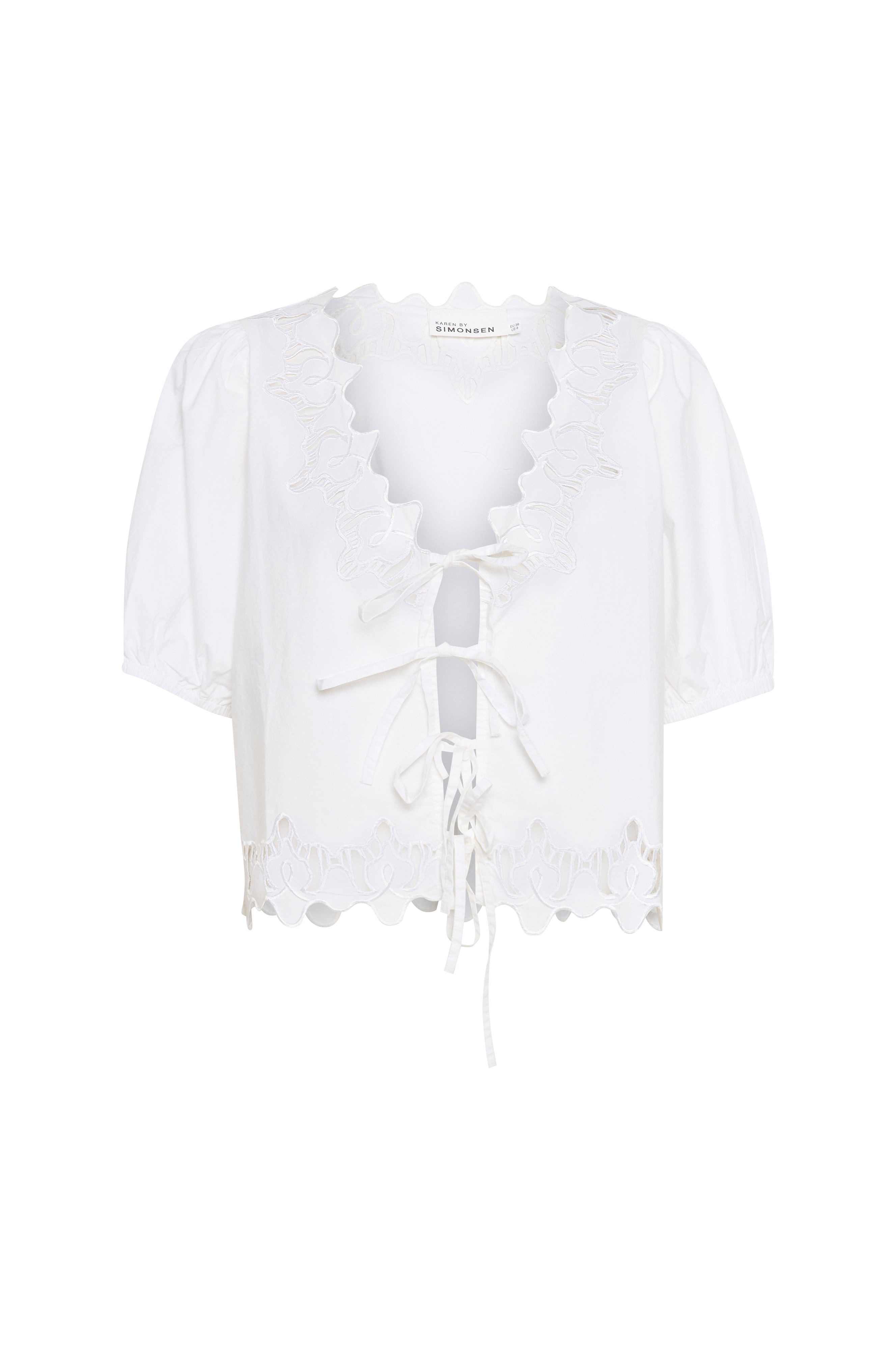 • Lige model med hulbroderier• V-formet halsudskæring• Bindebånd på forkant med udviklingen• Bredt ærme med elastik ved manchetterne• Bølgede kanter