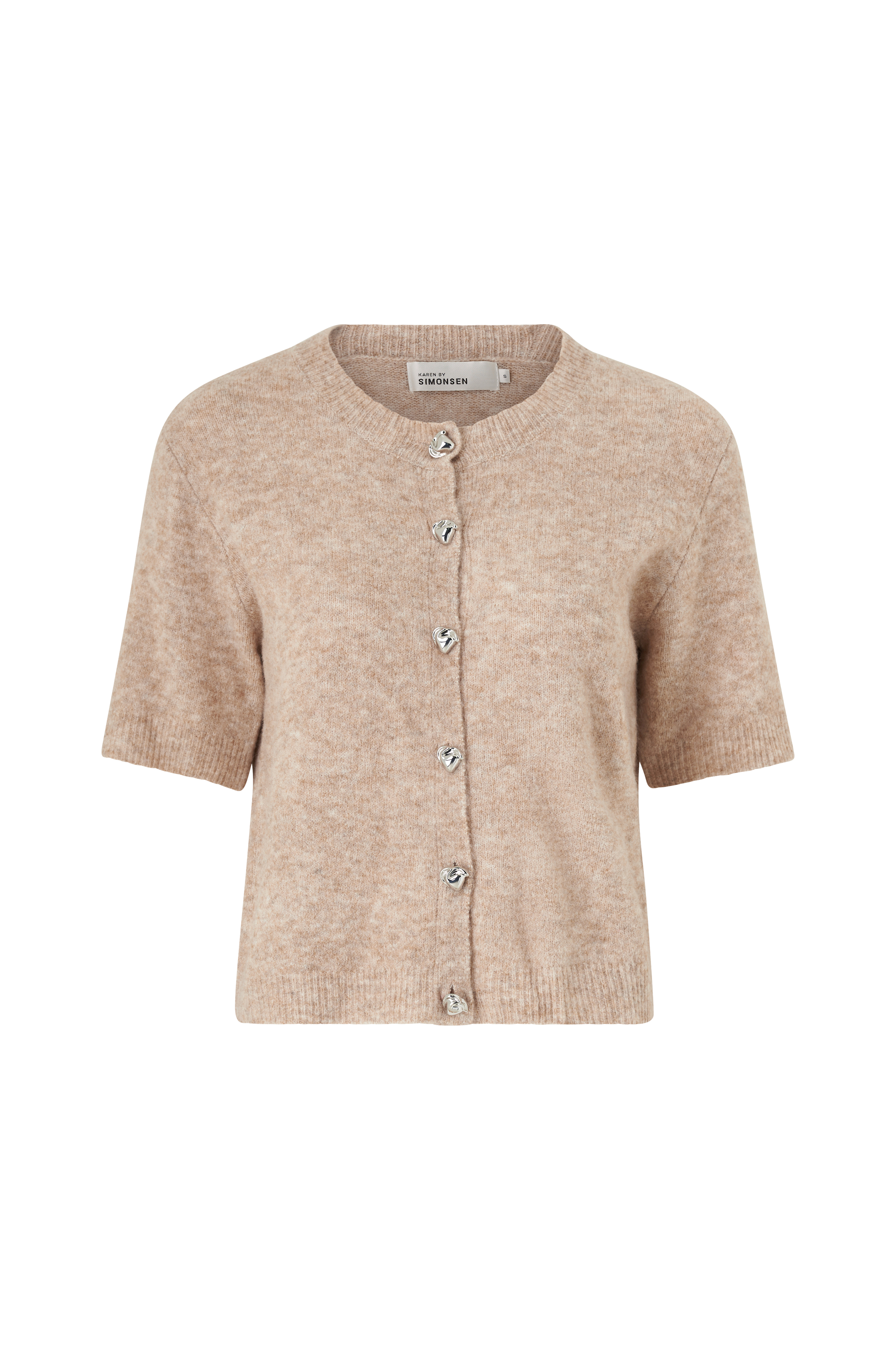 • Kortærmet cardigan i blød, fintstrikket Akrylblanding• Knapstolpe foran med dekorative, asymmetriske knapper• Afrundet halsudskæring med ribbet kant• Ribbet kant nederst og ved ærmeafslutningerne