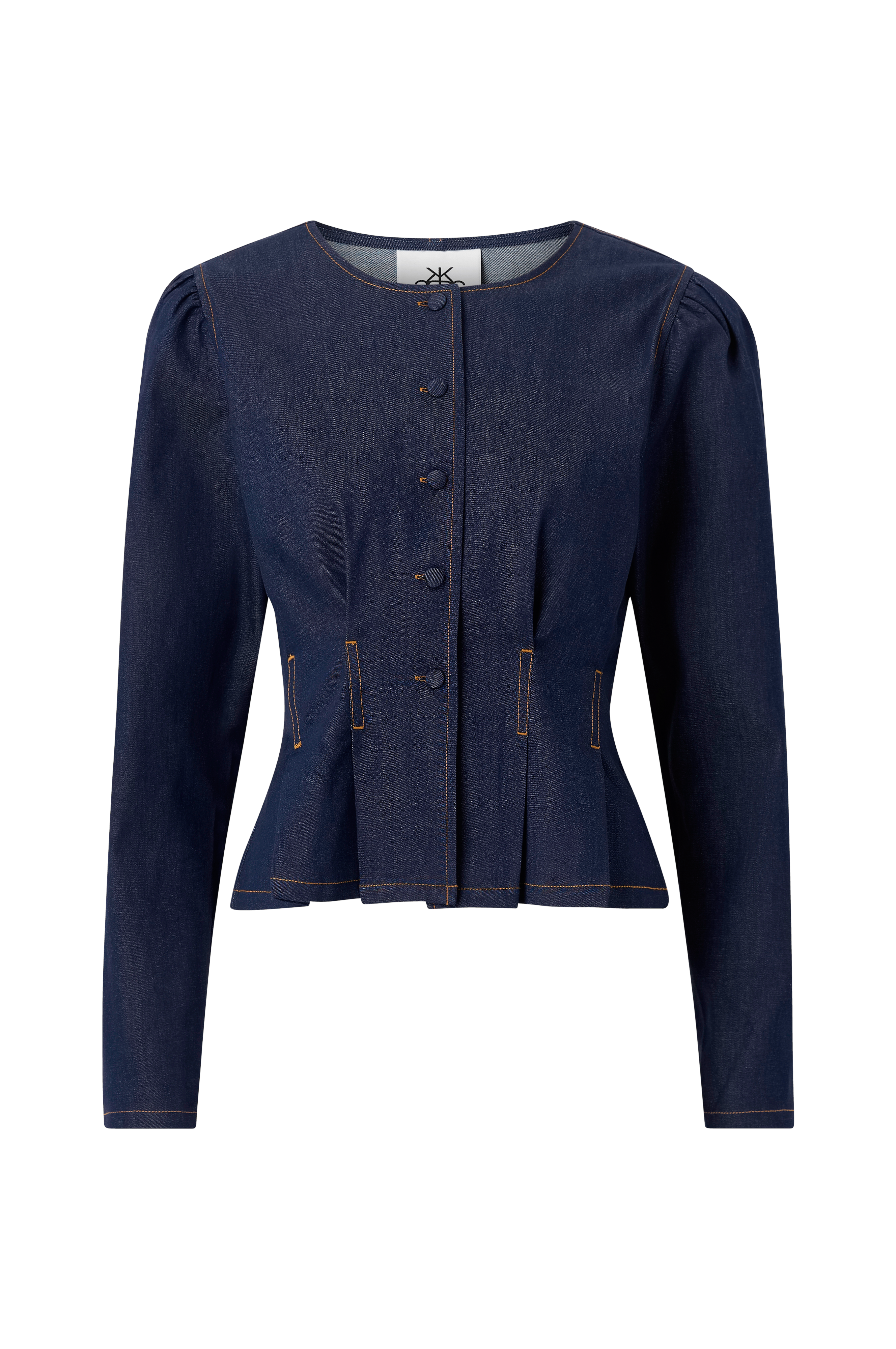 • Bluse i denim• Rund halsudskæring• Lange pufærmer• Defineret talje• Knaplukning