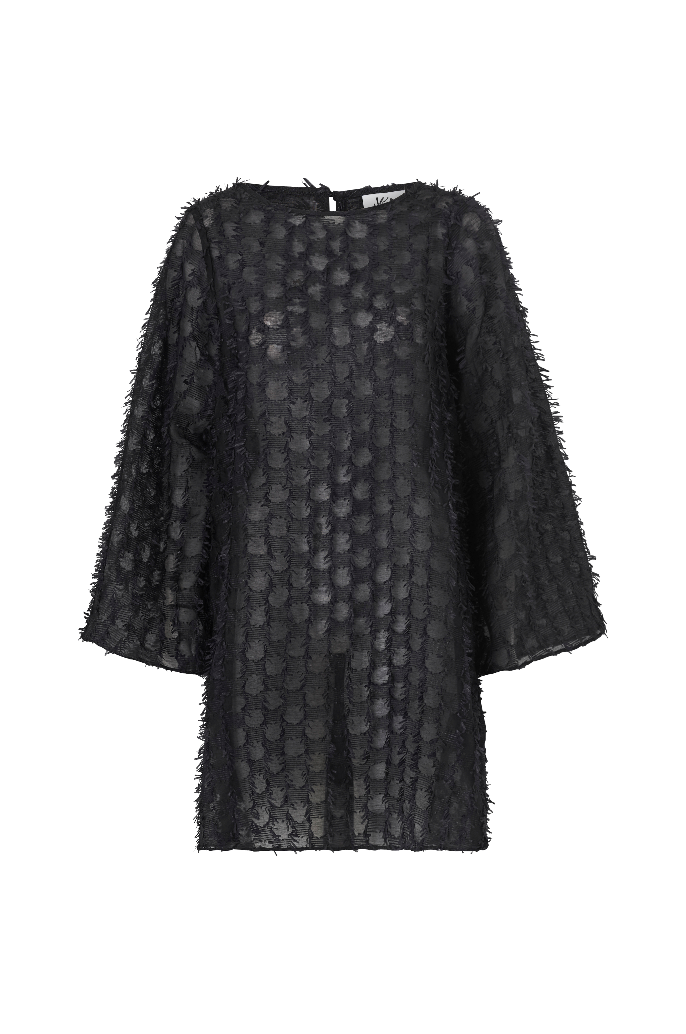• Mønstervævet model med svaj i chiffon• Bred halsudskæring med knap i nakken• Langt ærme med svaj• Foret• Længde: 92 cm i størrelse 36