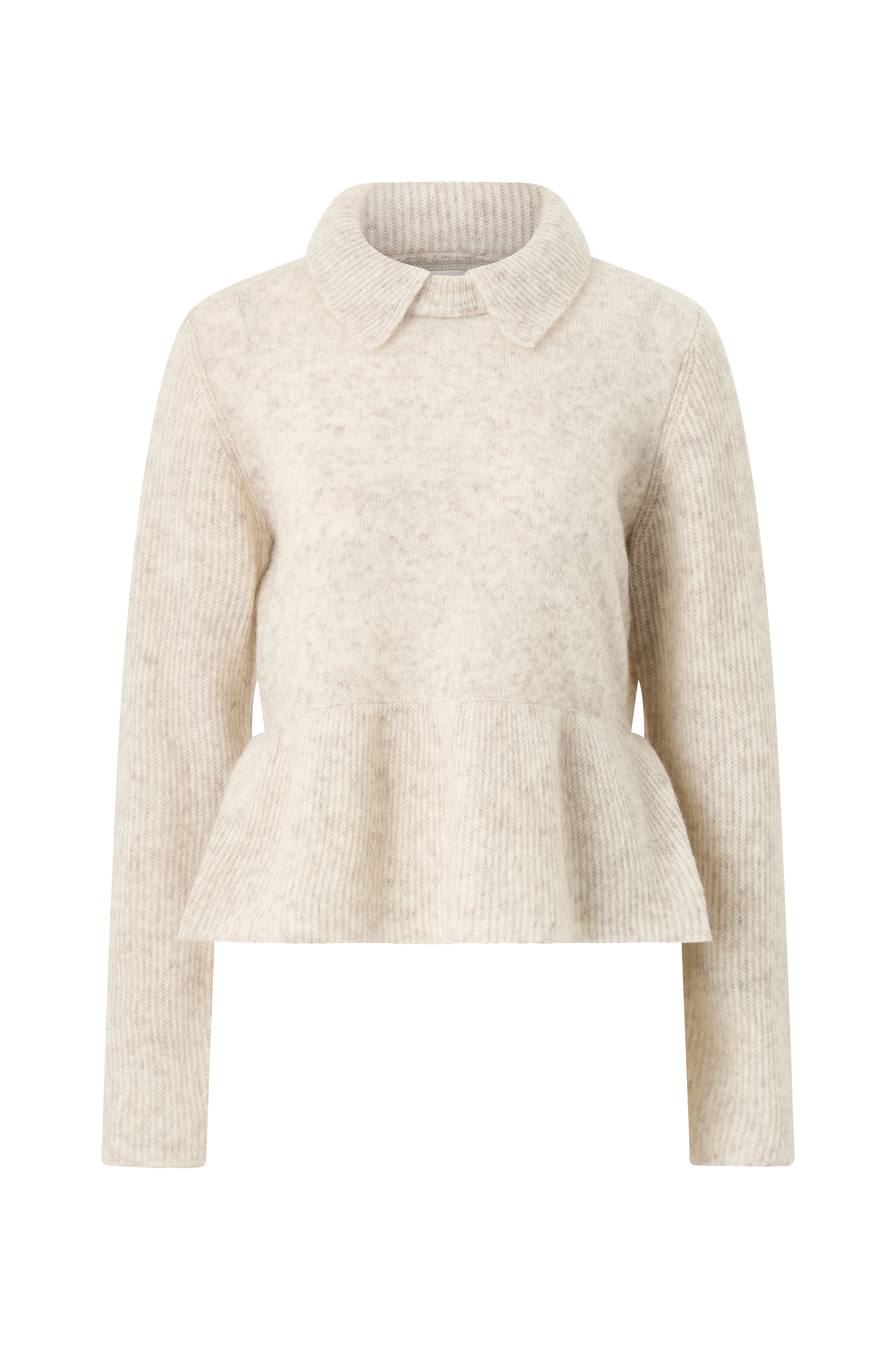 • Fintstrikket Pullover med ribstrikket krave• Lange, ribstrikkede ærmer• Volant nederst