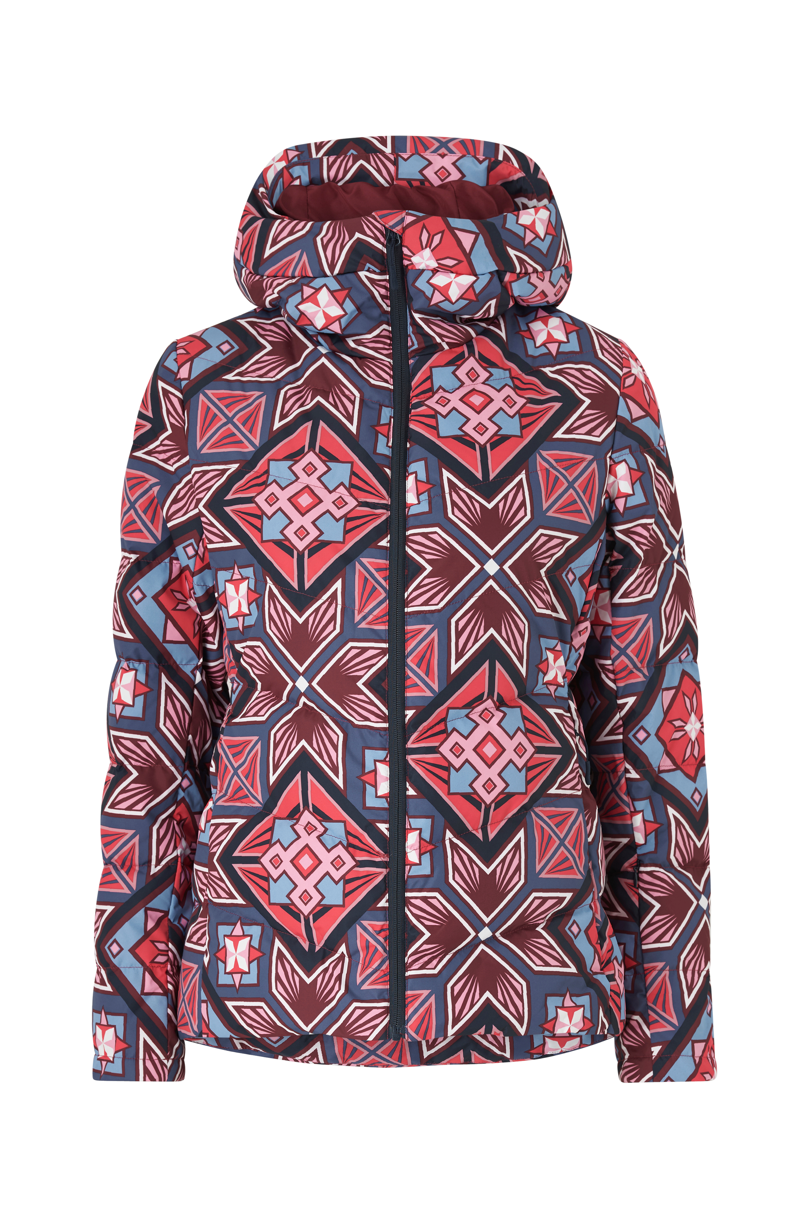 Et usædvanligt mønster på dunjakken, som er varm og afviser vand på en rimelig måde.
