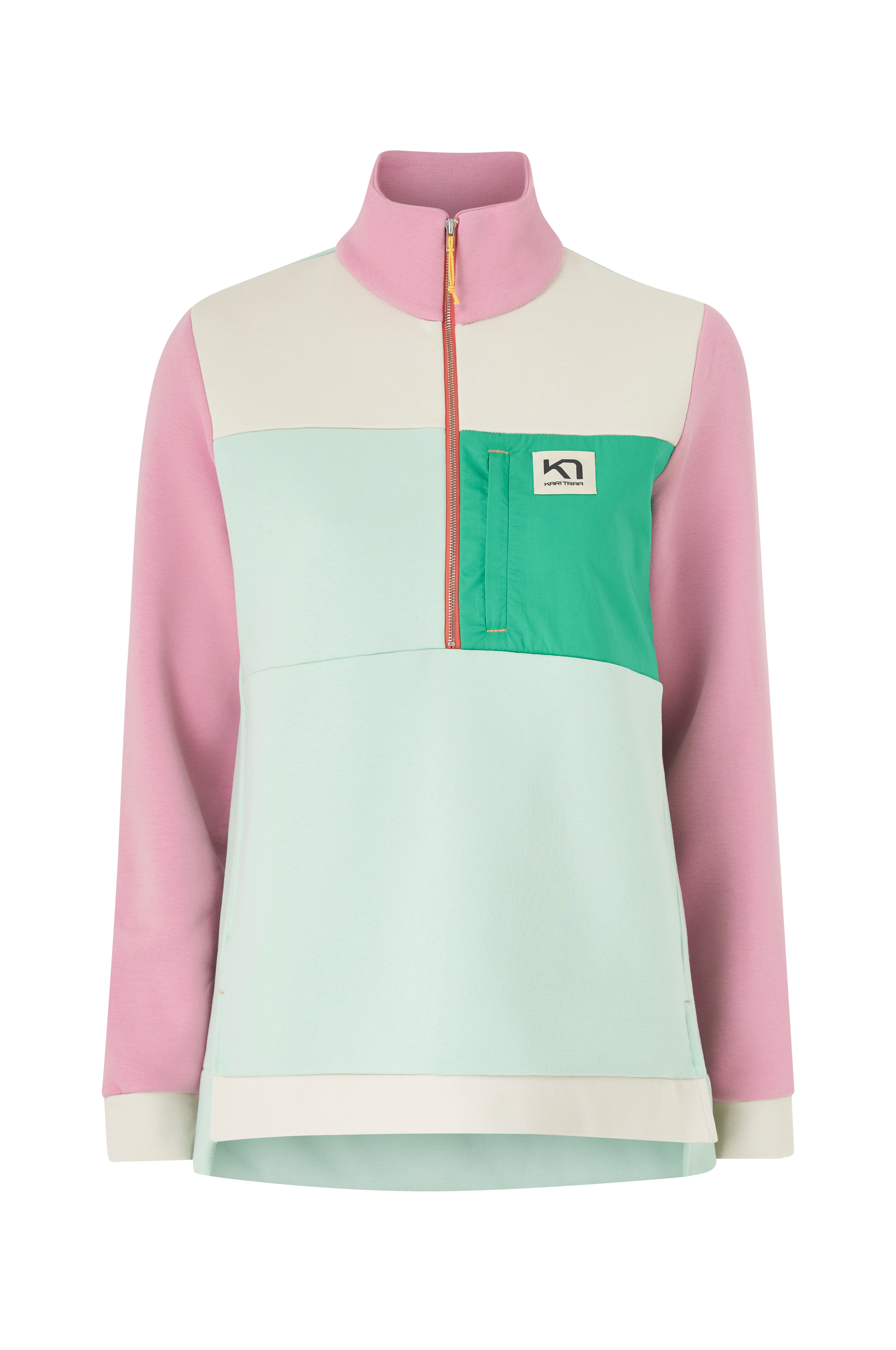 • Funktionstrøje med blød, børstet inderside• Løs pasform• Høj halsudskæring• Halvlang lynlås• Sidelommer• Vævet brystlomme med lynlås• Ventilation nede i siderne• Noget længere bagside• Ribmanchetter ved manchetterne
